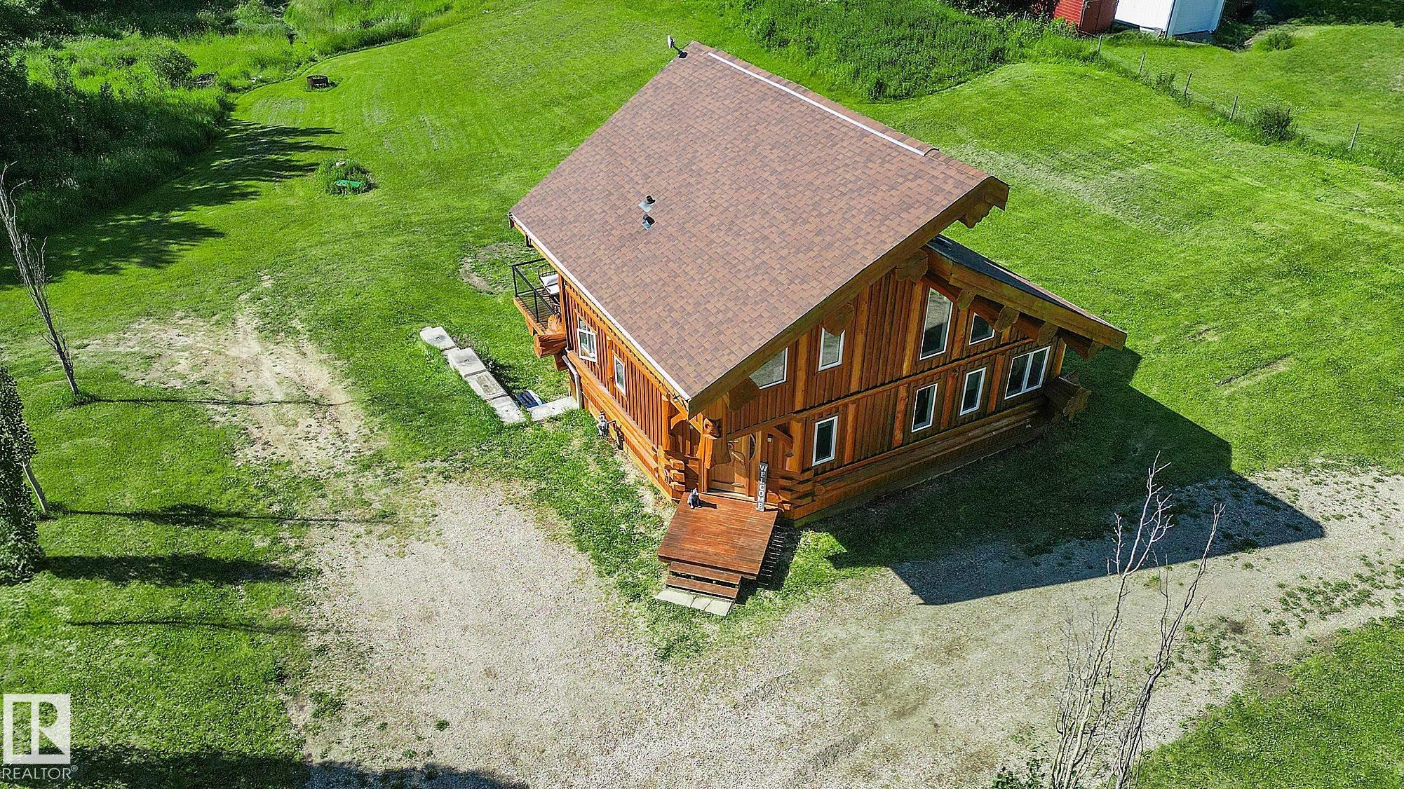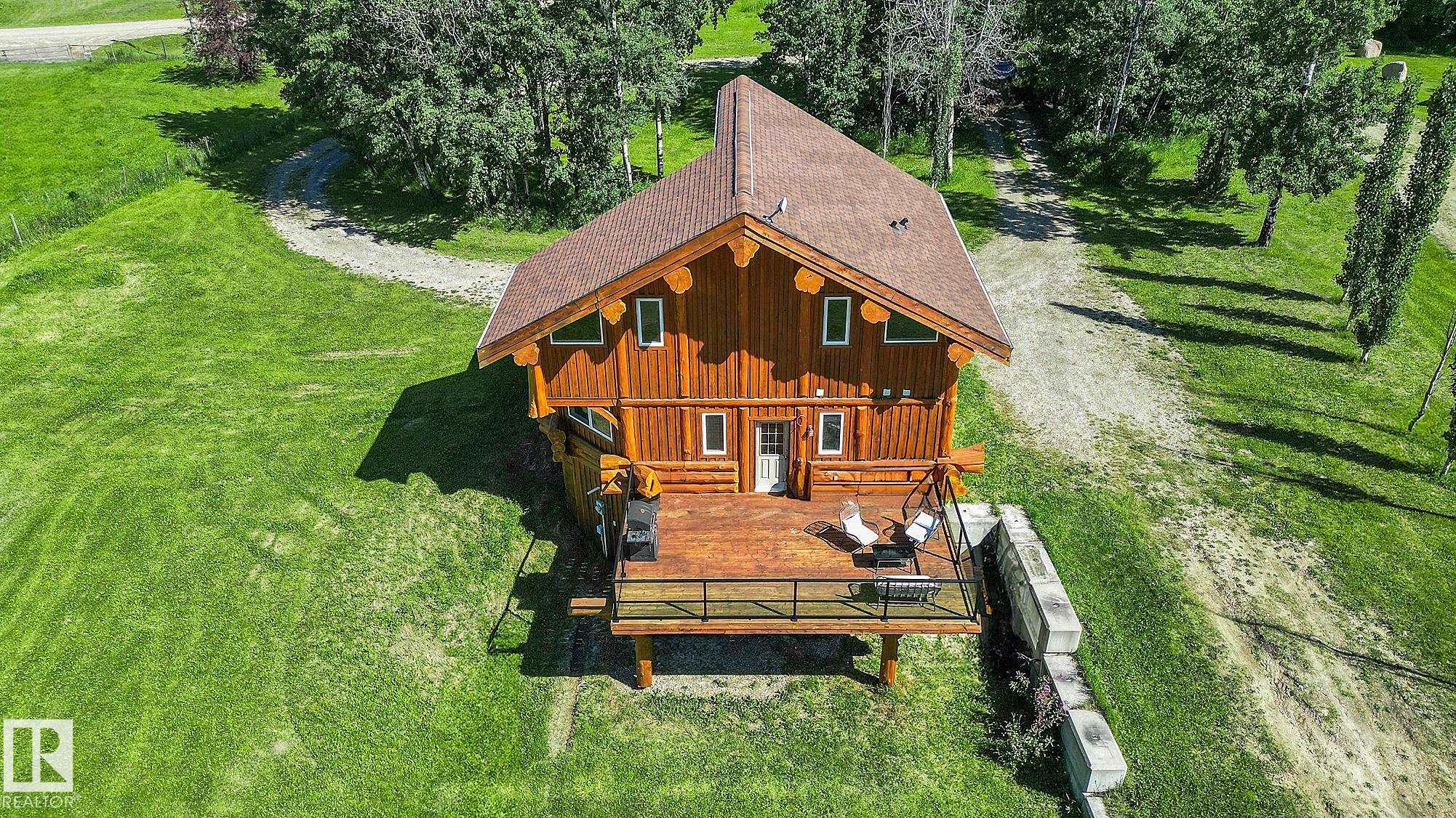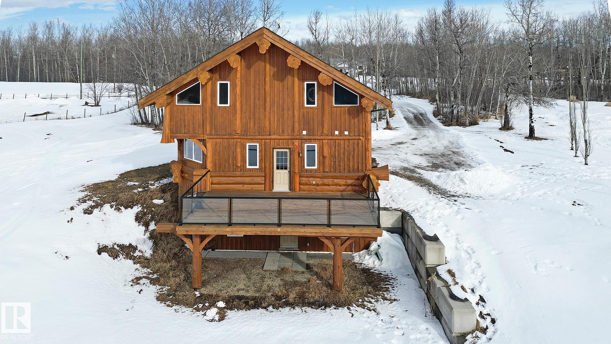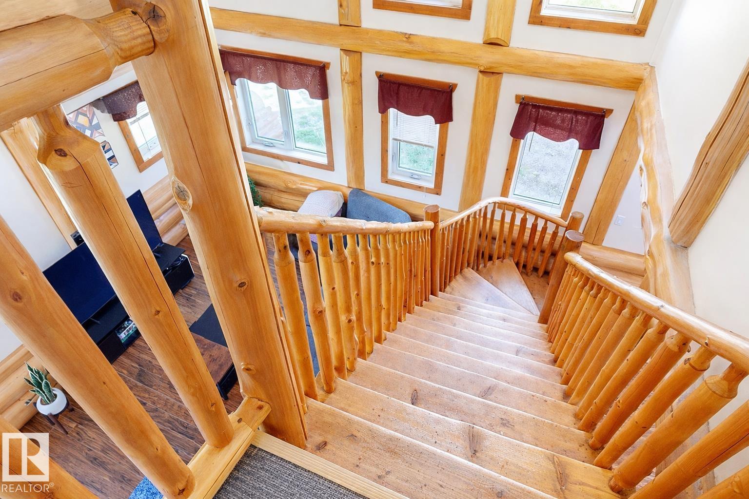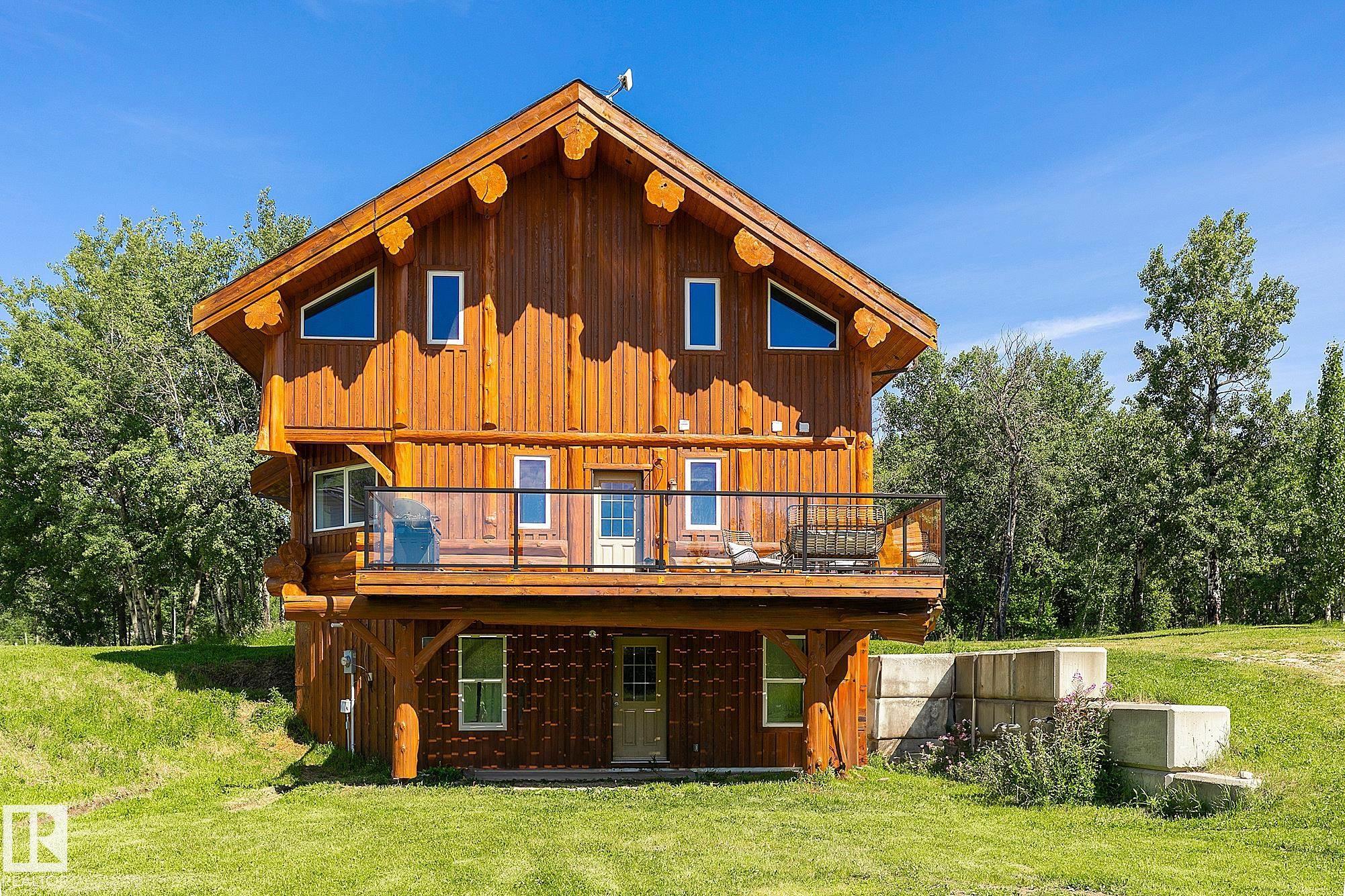 Live the acreage dream! Welcome to this stunning one-of-a-kind log home set on 2.03 acres surrounded by breathtaking views! Filled with character including a beautiful handcrafted log staircase, soaring timber beams & authentic rich wood finishing. Main floor features endless windows, open-to-above space & modern flooring. Charming country-style kitchen offers warm wood cabinetry, updated appliances, ample counter space, & a bright window above the sink. Open-concept living and dining area provides plenty ...
