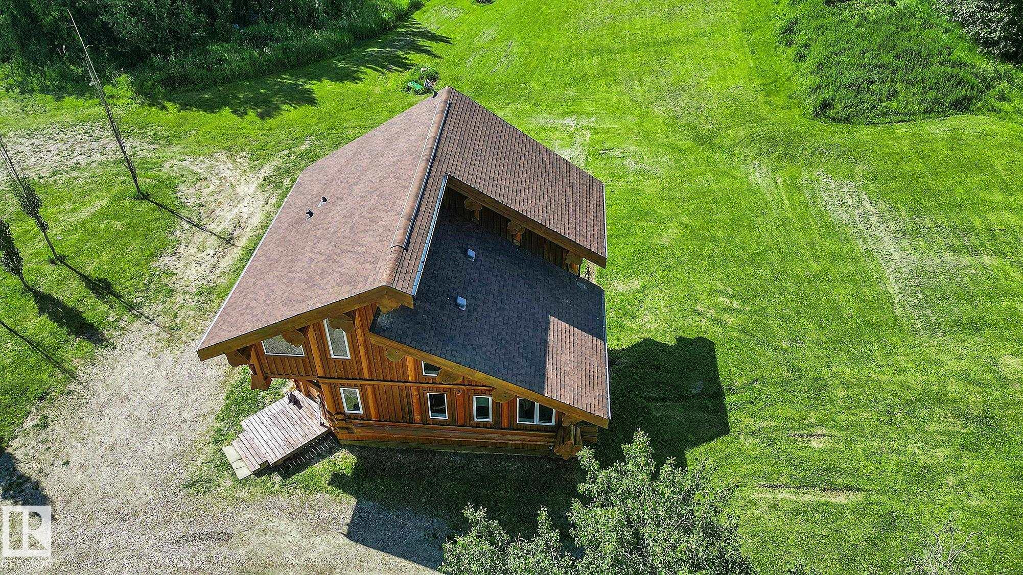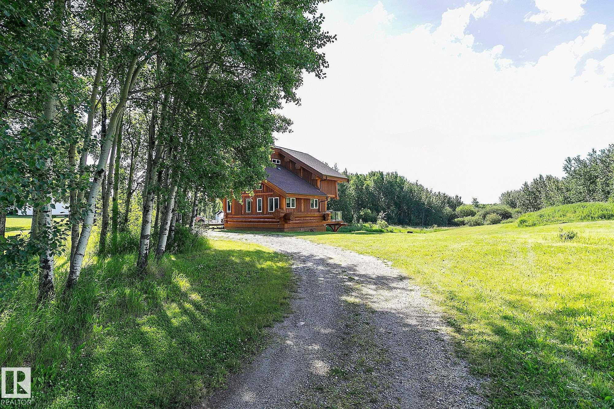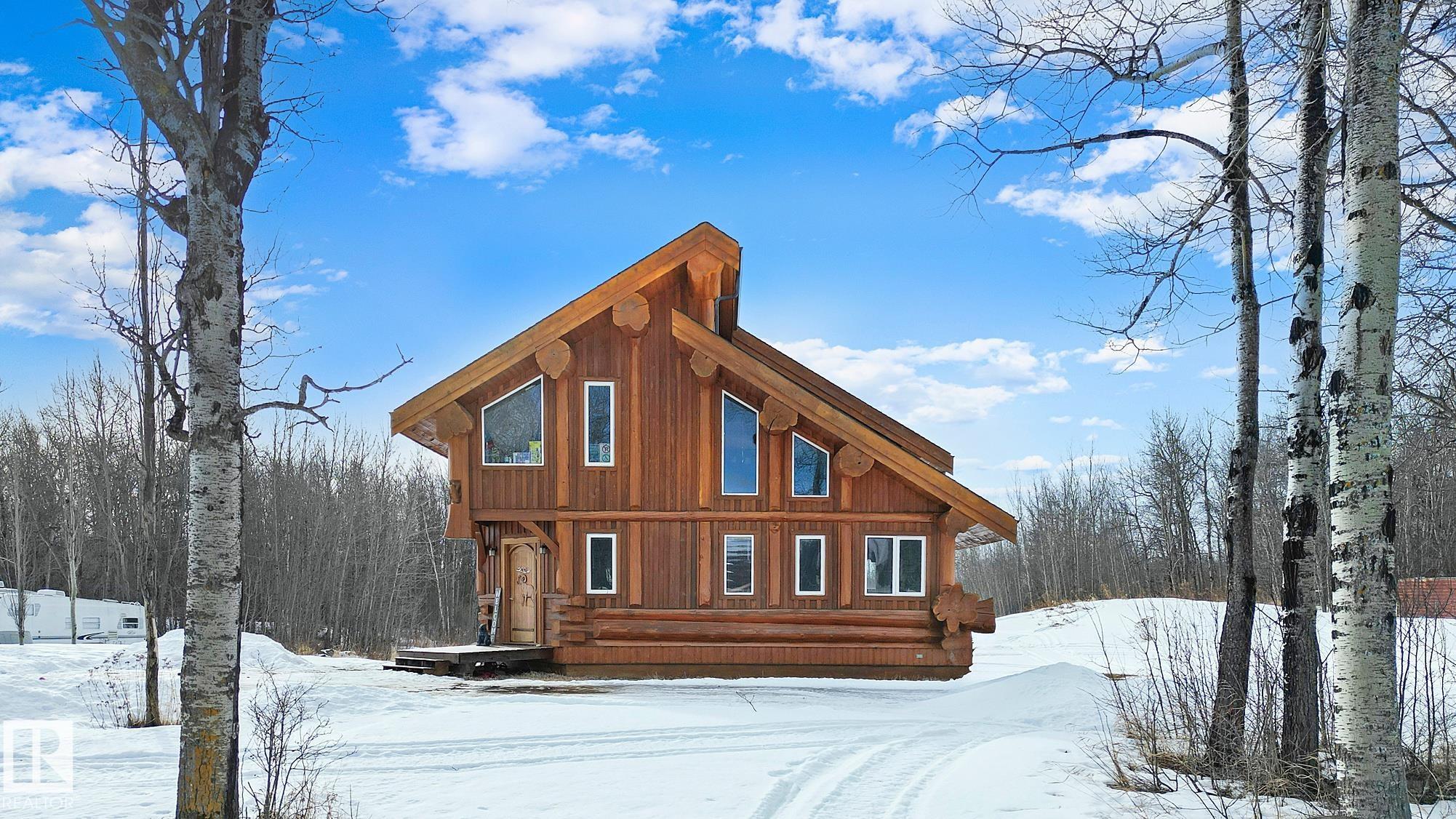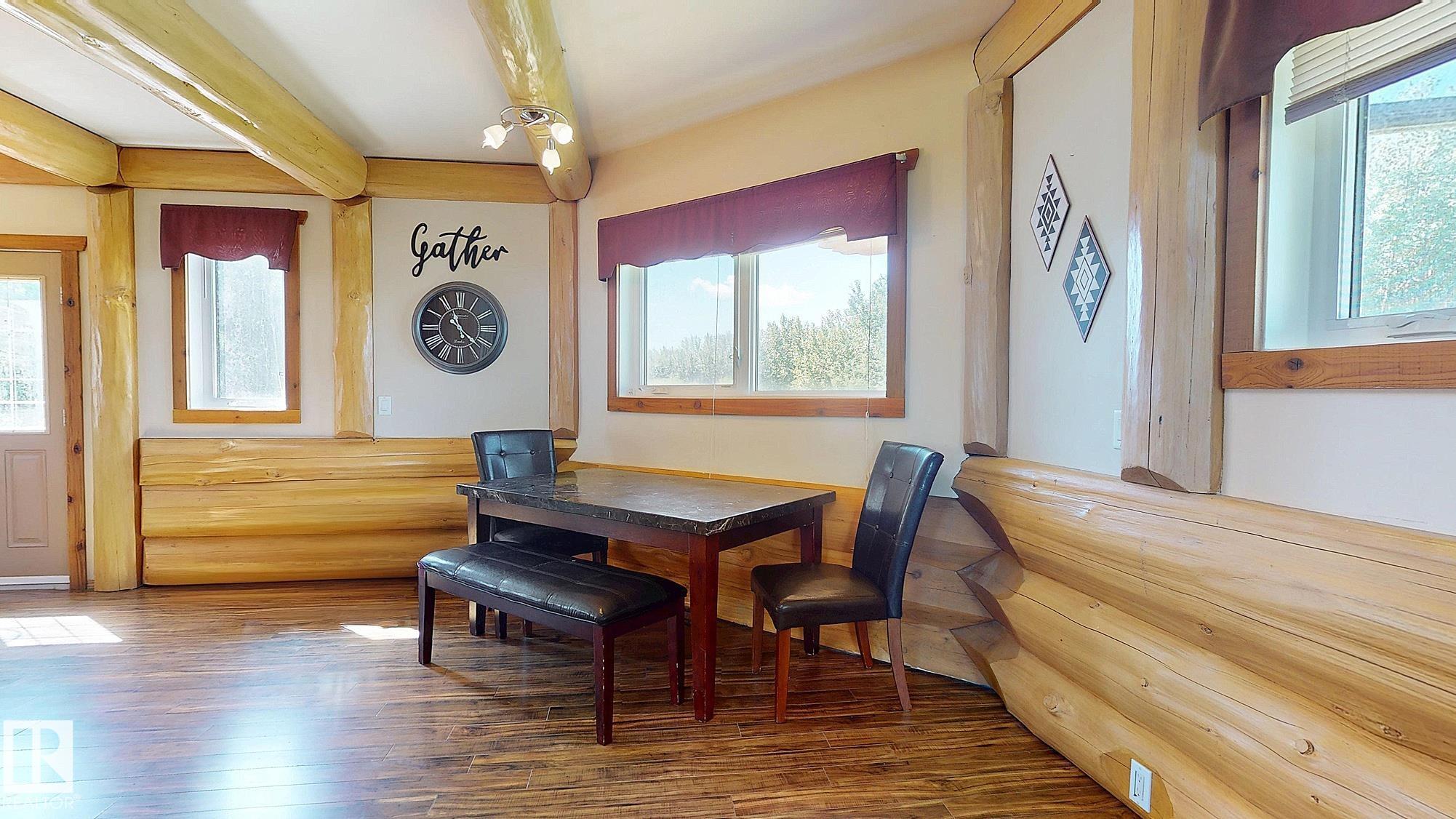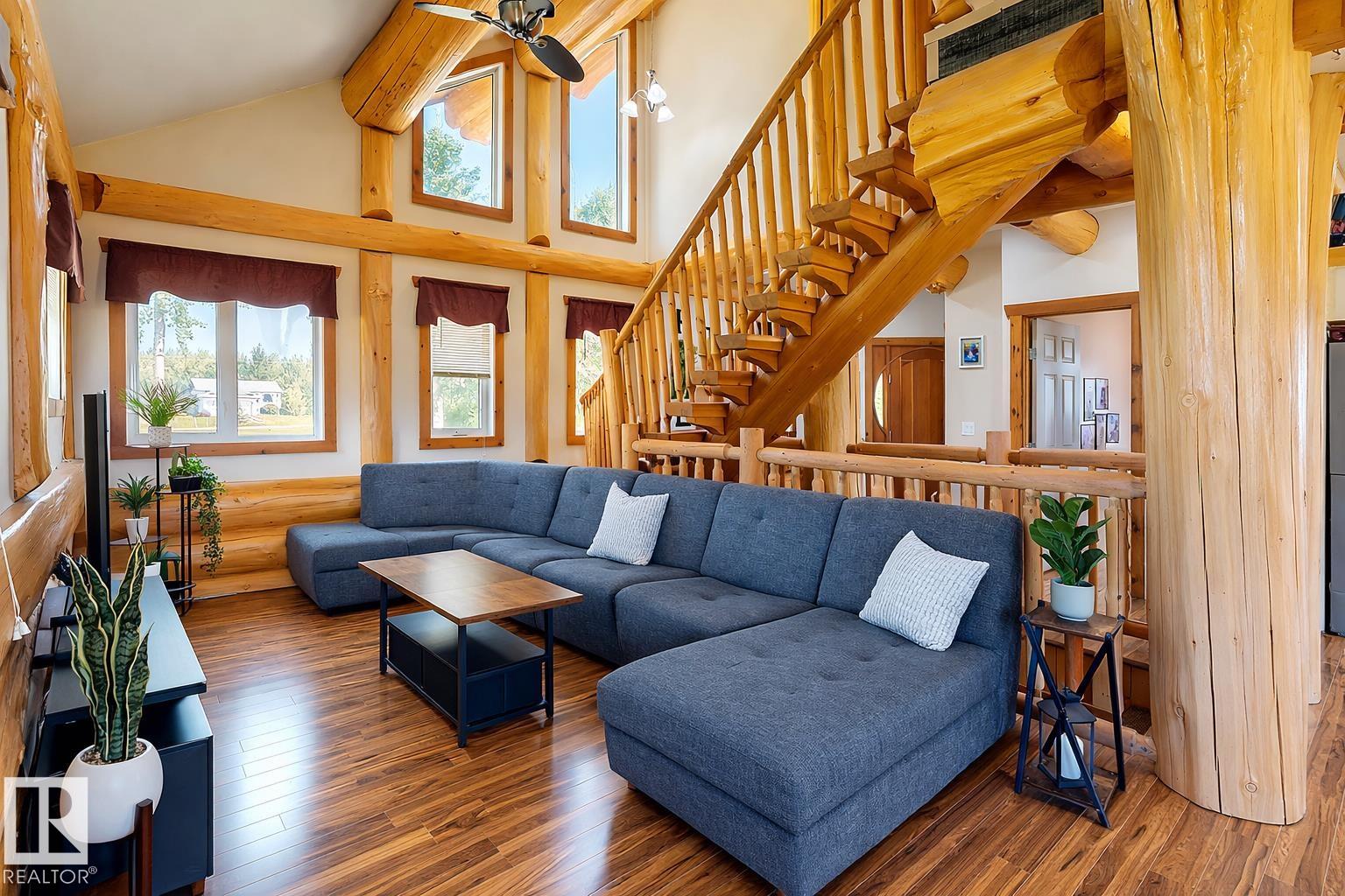 Live the acreage dream! Welcome to this stunning one-of-a-kind log home set on 2.03 acres surrounded by breathtaking views! Filled with character including a beautiful handcrafted log staircase, soaring timber beams & authentic rich wood finishing. Main floor features endless windows, open-to-above space & modern flooring. Charming country-style kitchen offers warm wood cabinetry, updated appliances, ample counter space, & a bright window above the sink. Open-concept living and dining area provides plenty ...