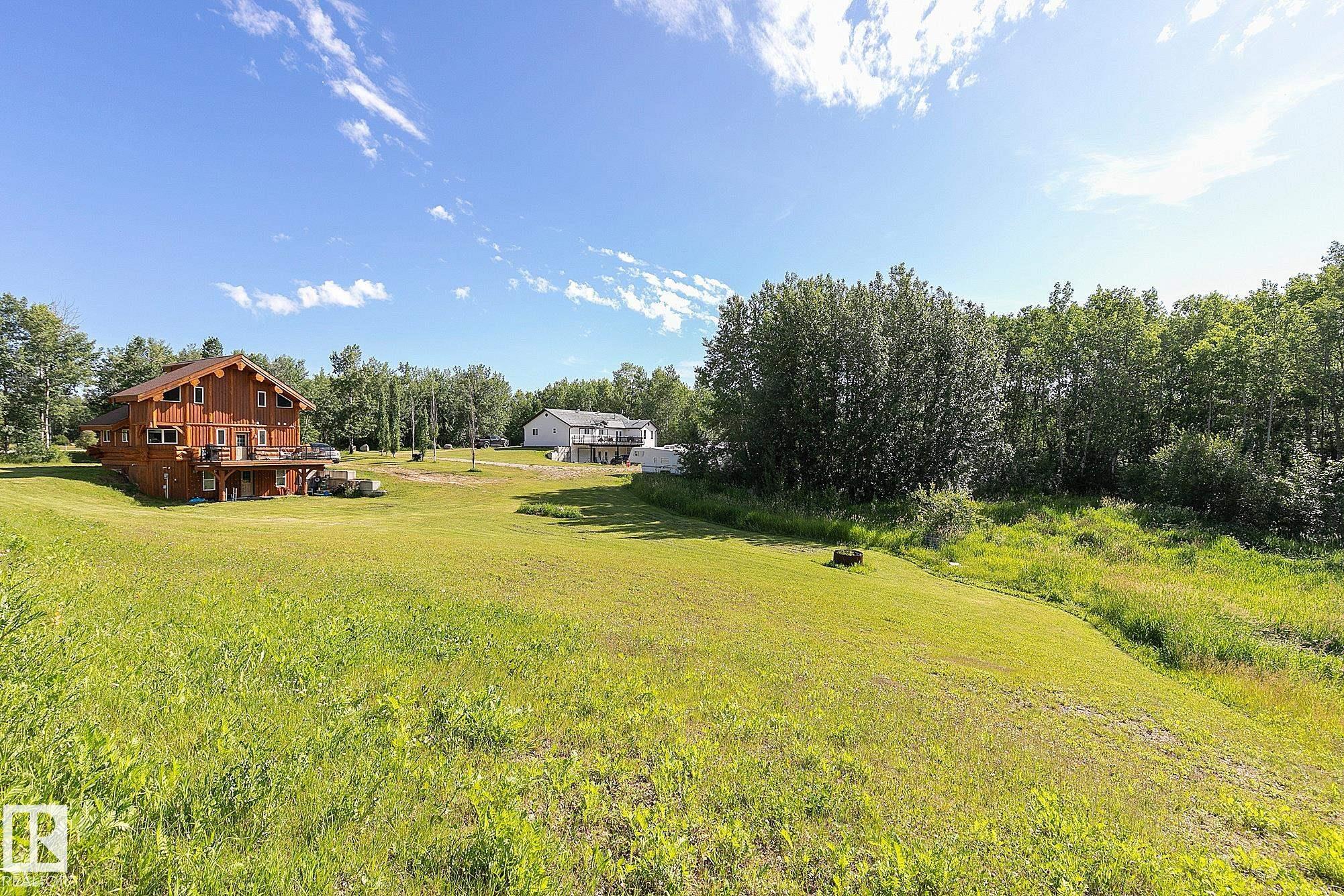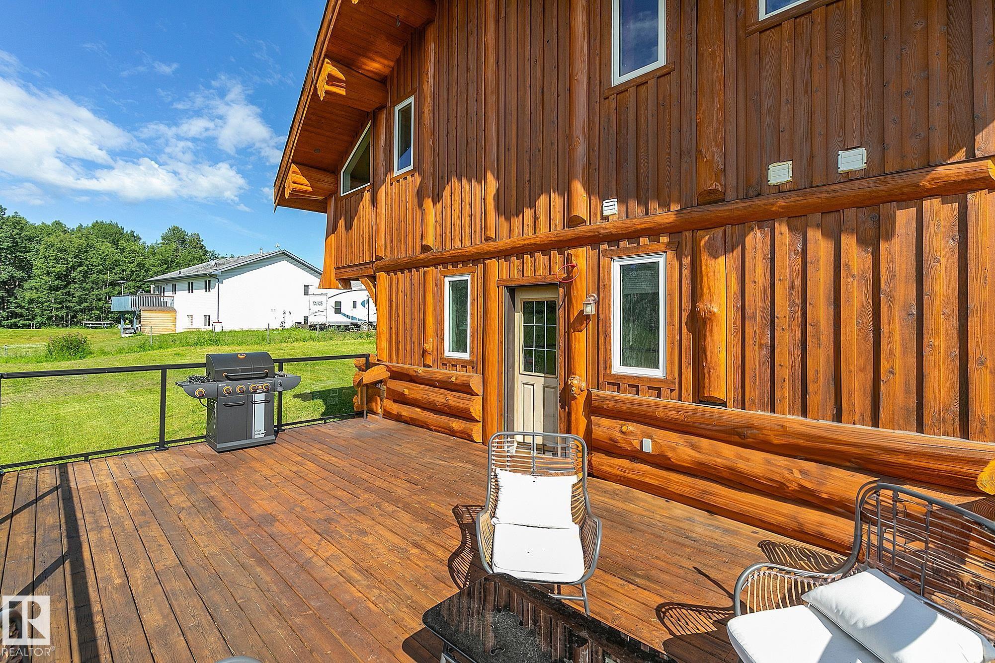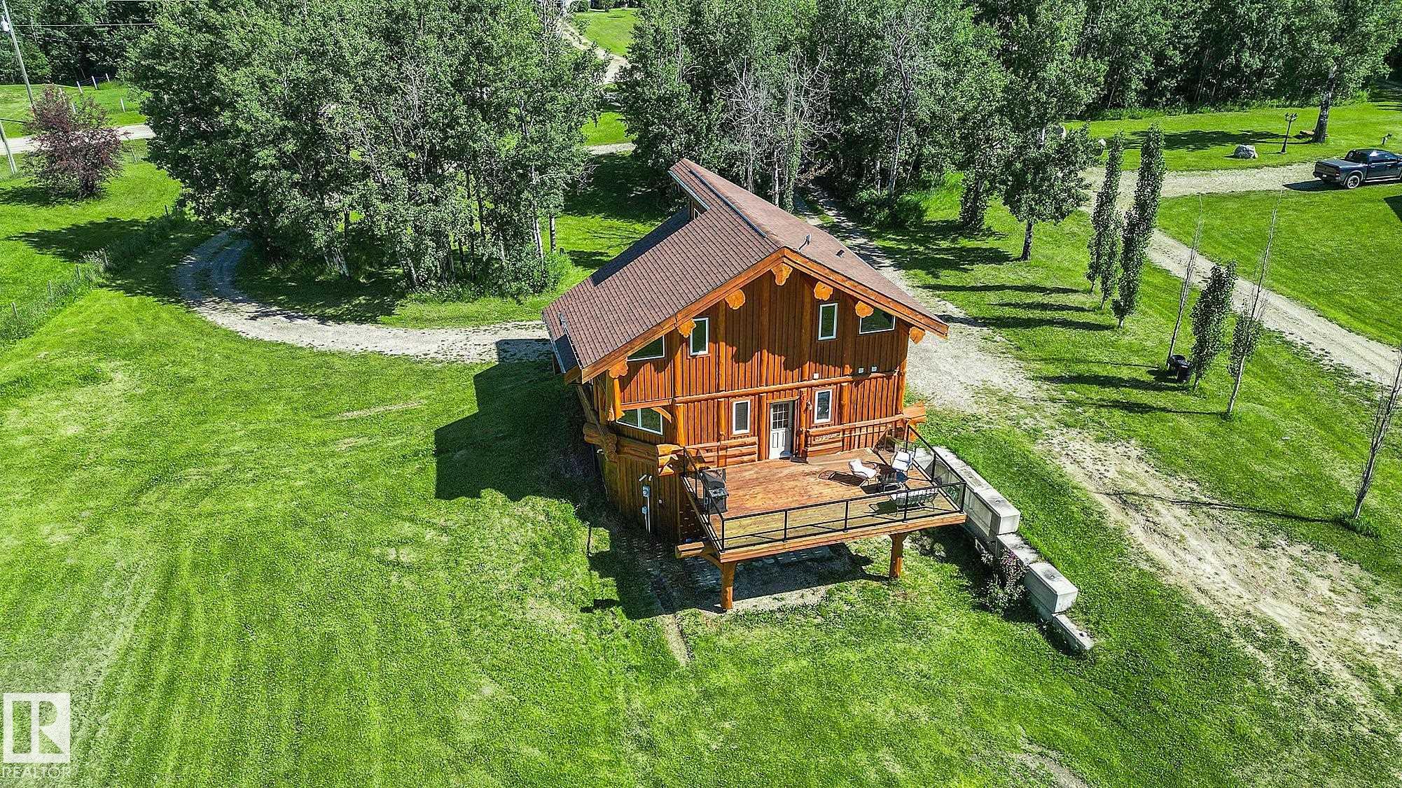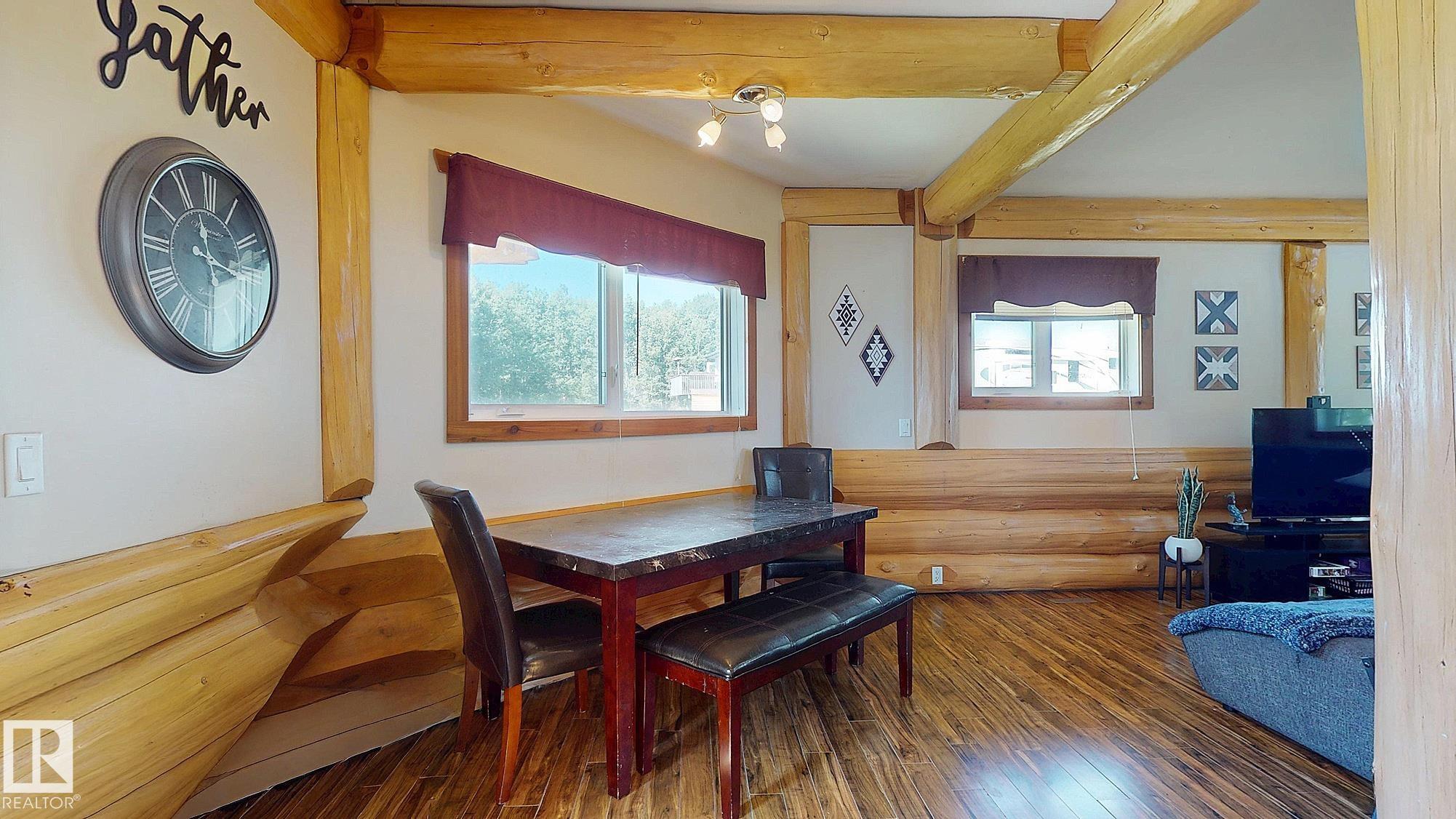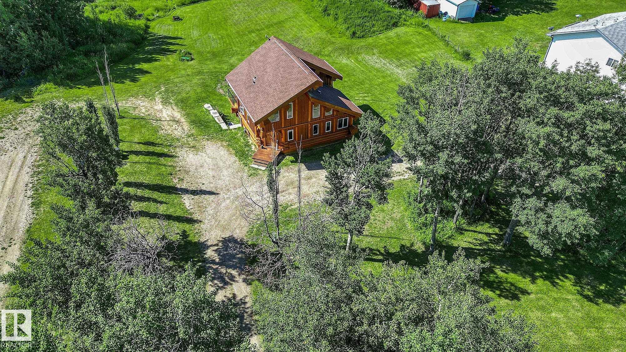 Live the acreage dream! Welcome to this stunning one-of-a-kind log home set on 2.03 acres surrounded by breathtaking views! Filled with character including a beautiful handcrafted log staircase, soaring timber beams & authentic rich wood finishing. Main floor features endless windows, open-to-above space & modern flooring. Charming country-style kitchen offers warm wood cabinetry, updated appliances, ample counter space, & a bright window above the sink. Open-concept living and dining area provides plenty ...
