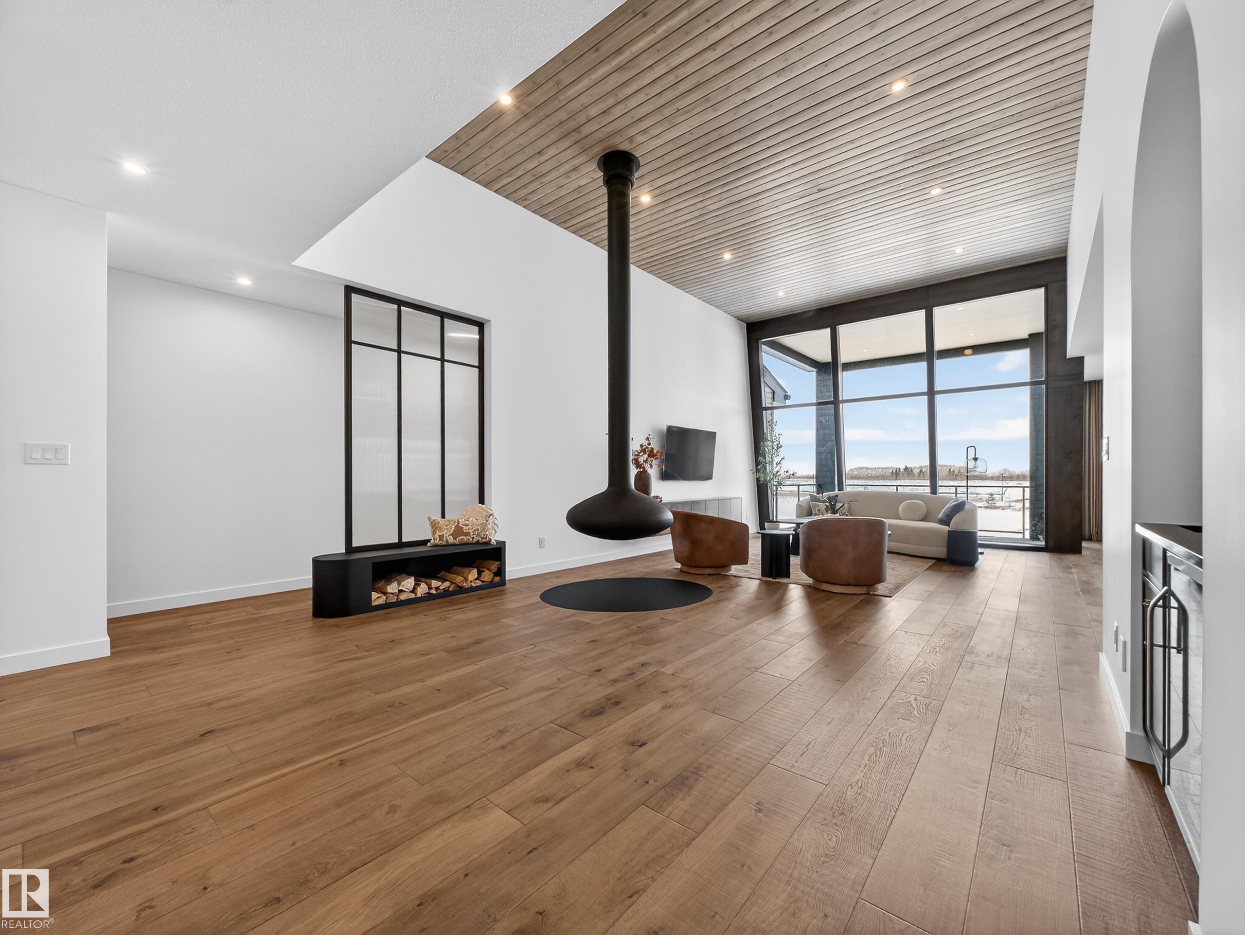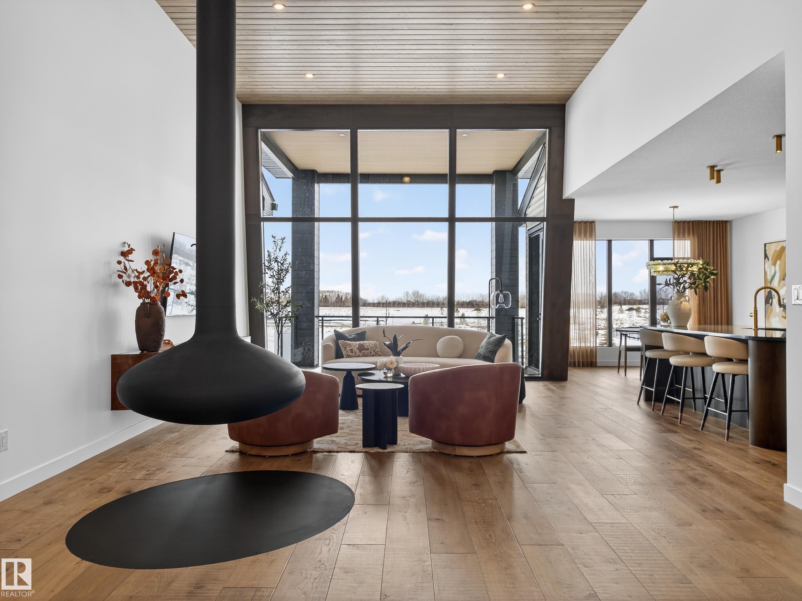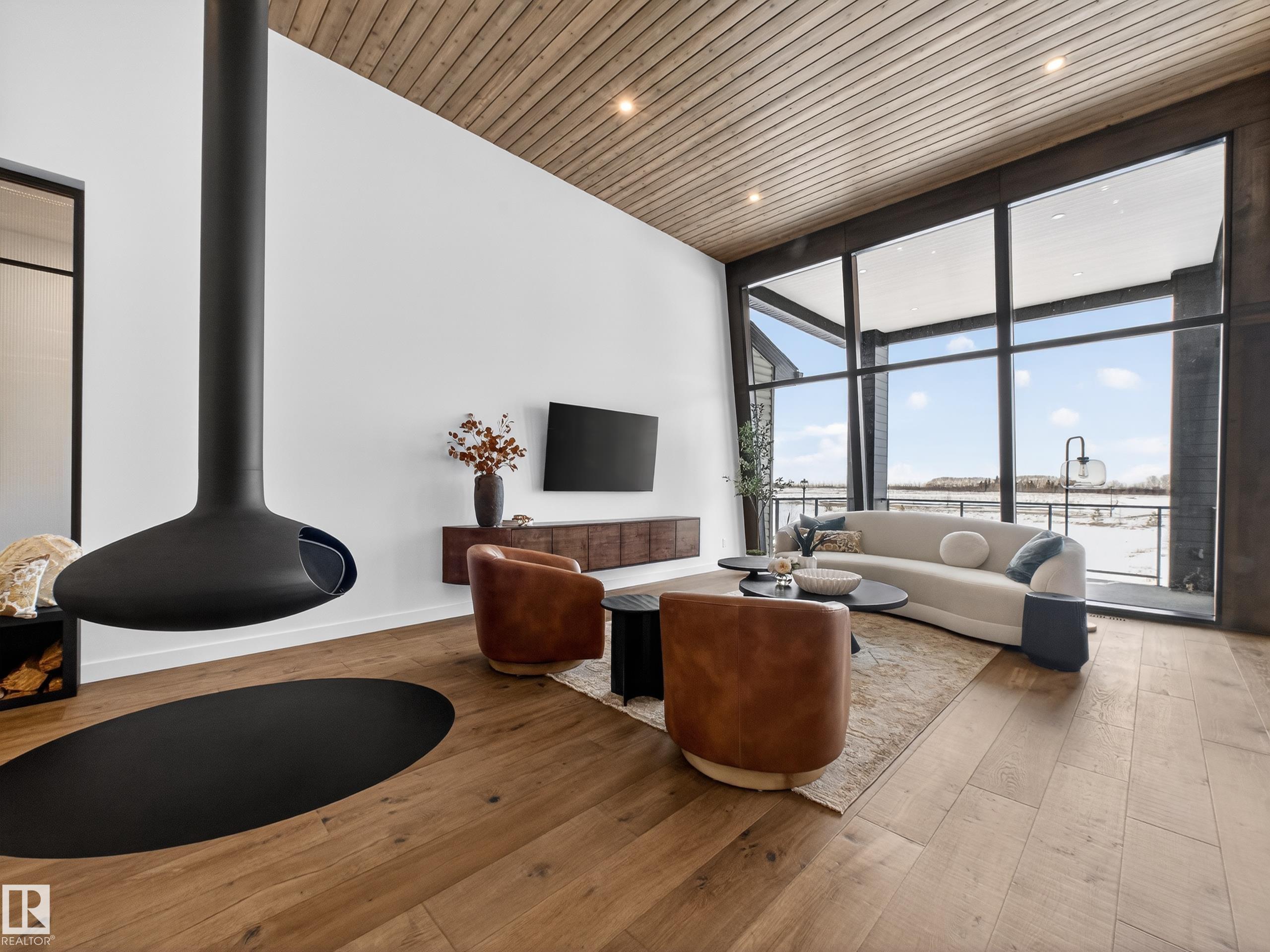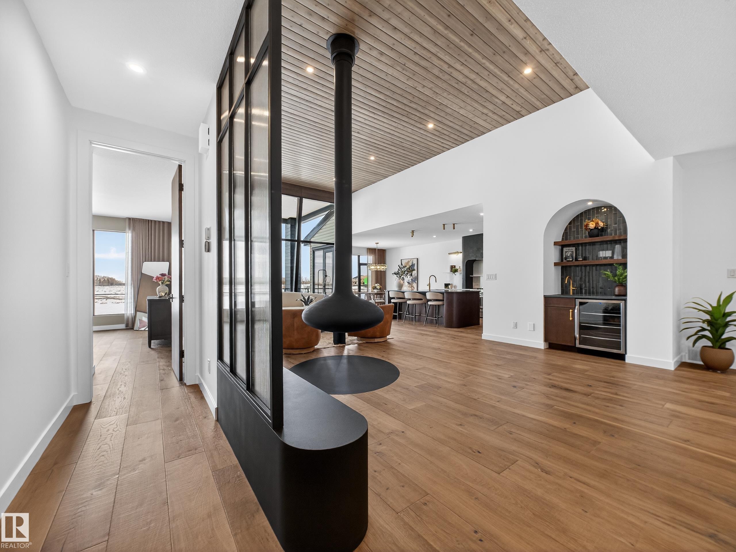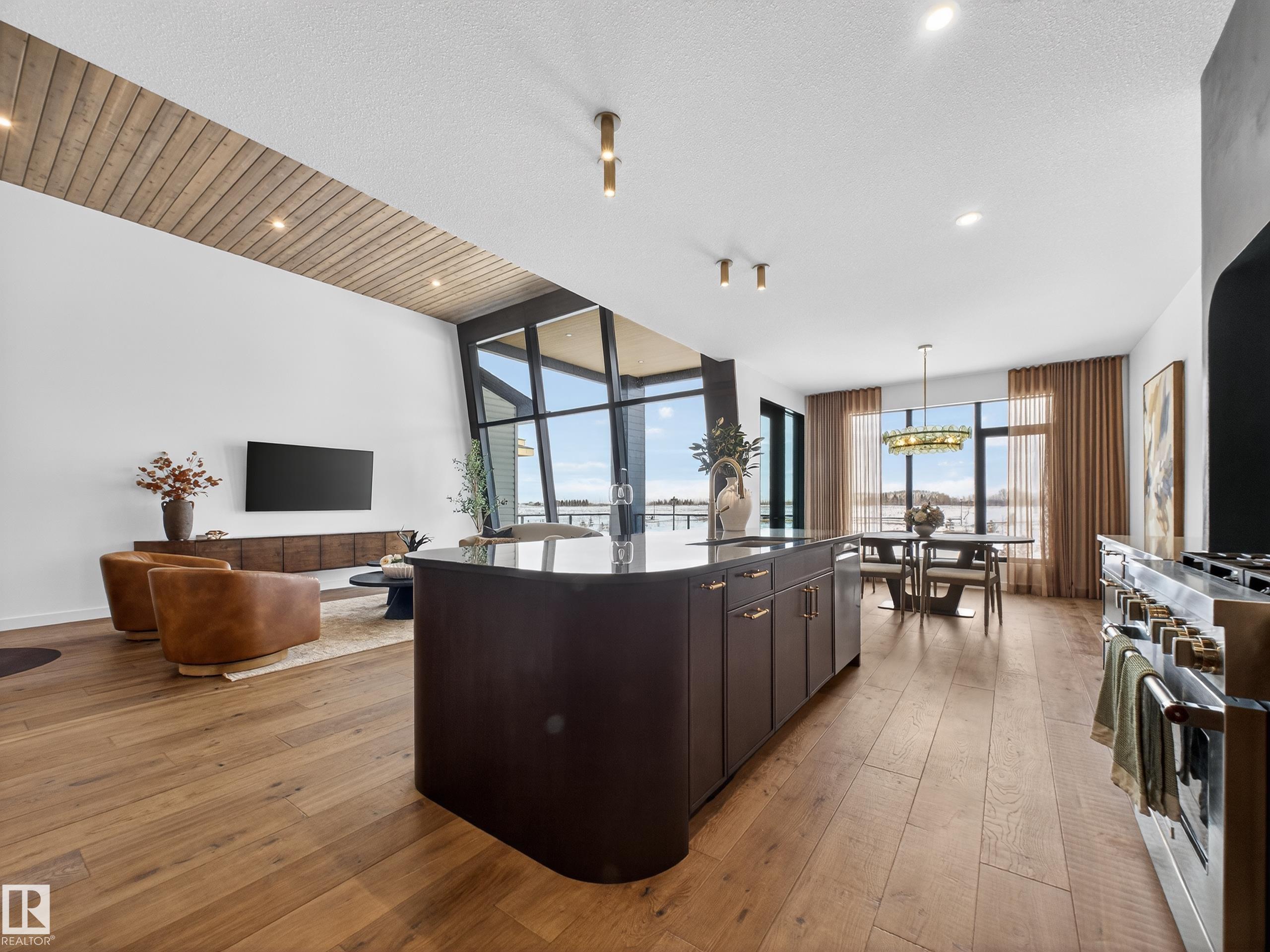 Nestled in a private cul-de-sac in prestigious Élan, this extraordinary 2101 SqFt walkout bungalow backs onto the lake & represents uncompromising craftsmanship by Homes By Sher-Bilt, a boutique luxury builder crafting select custom homes since 1979 with owner Darell Koop personally overseeing every detail. Designed with striking mid-century modern influence, the residence features soaring 13’ ceilings, a dramatic sloped commercial window wall, cedar-clad great room ceiling, and a suspended rotating wood-bu...