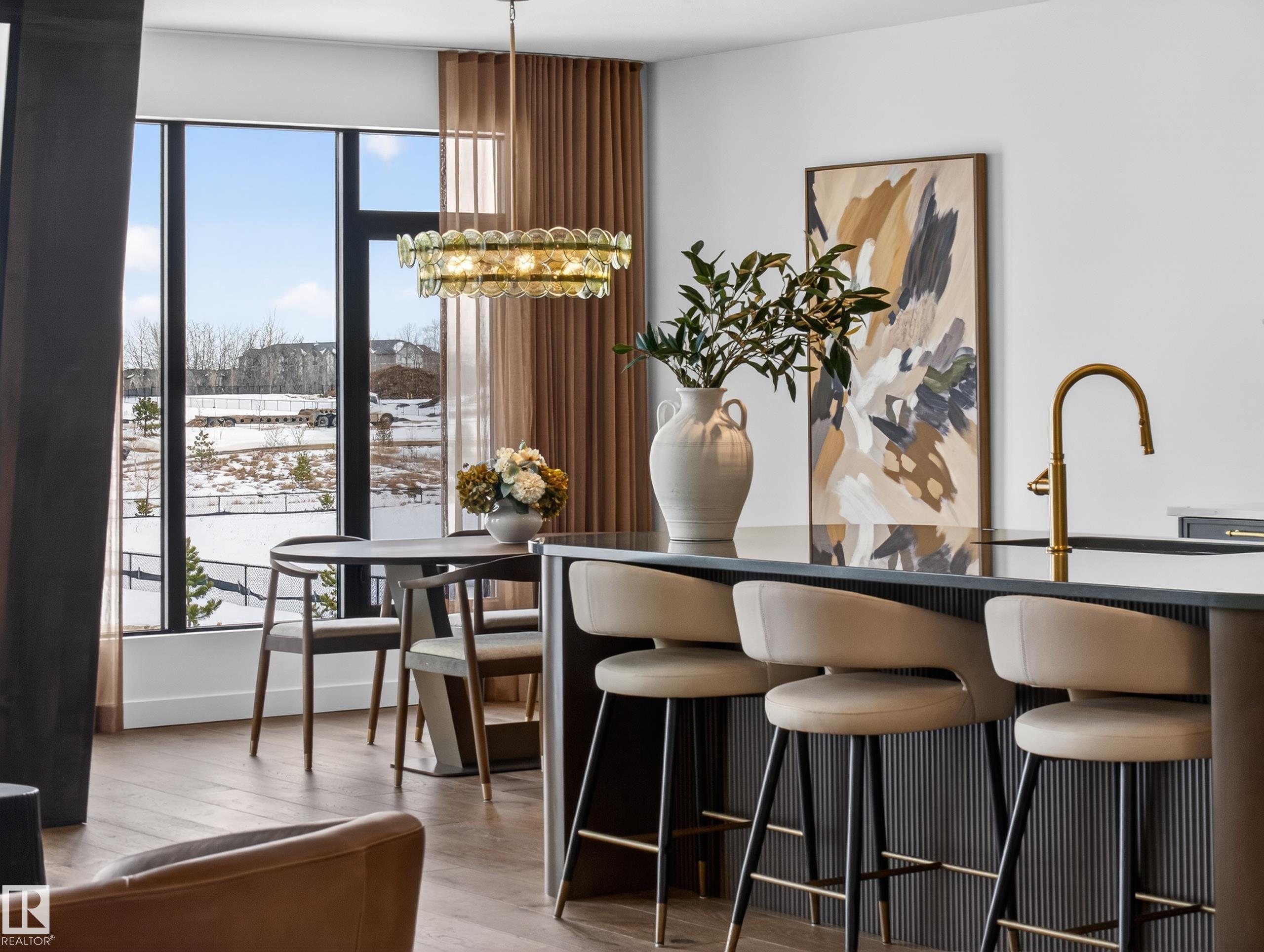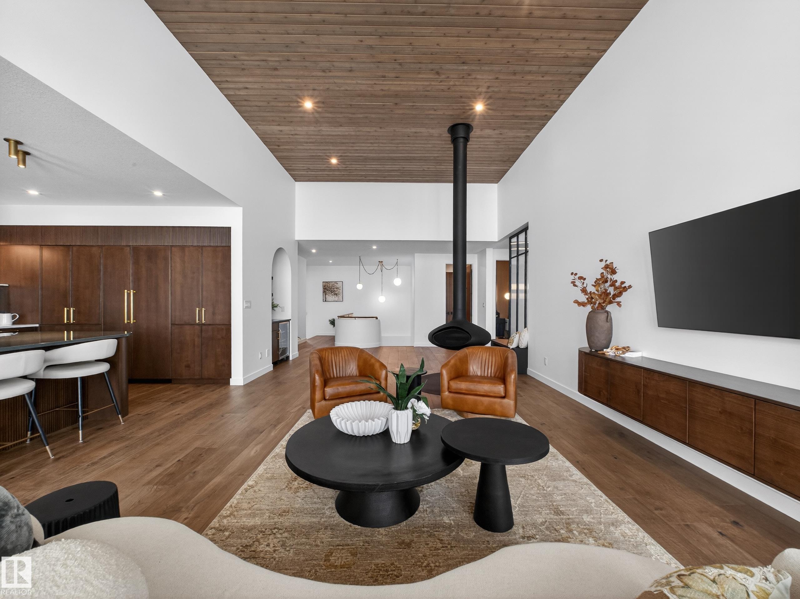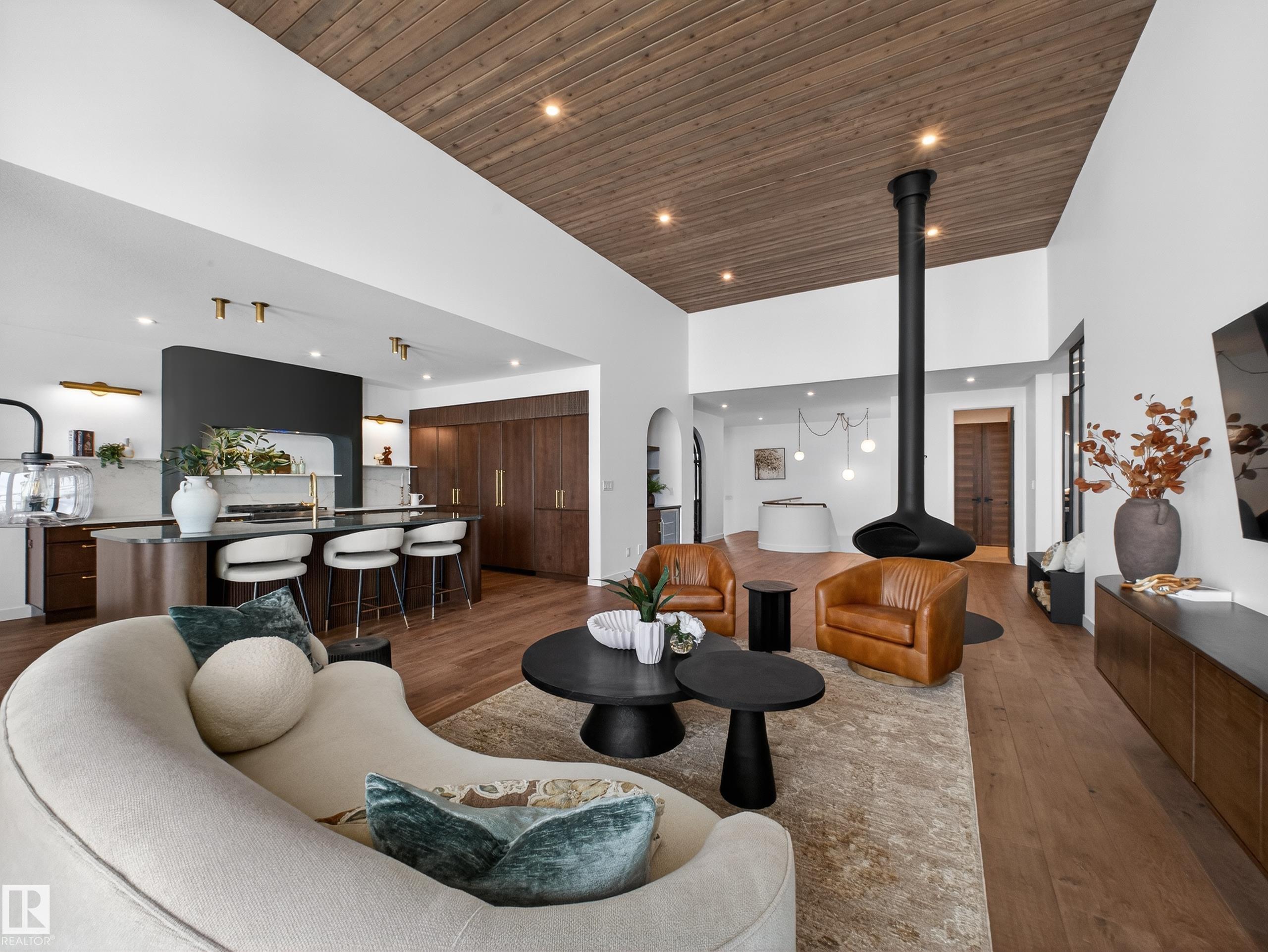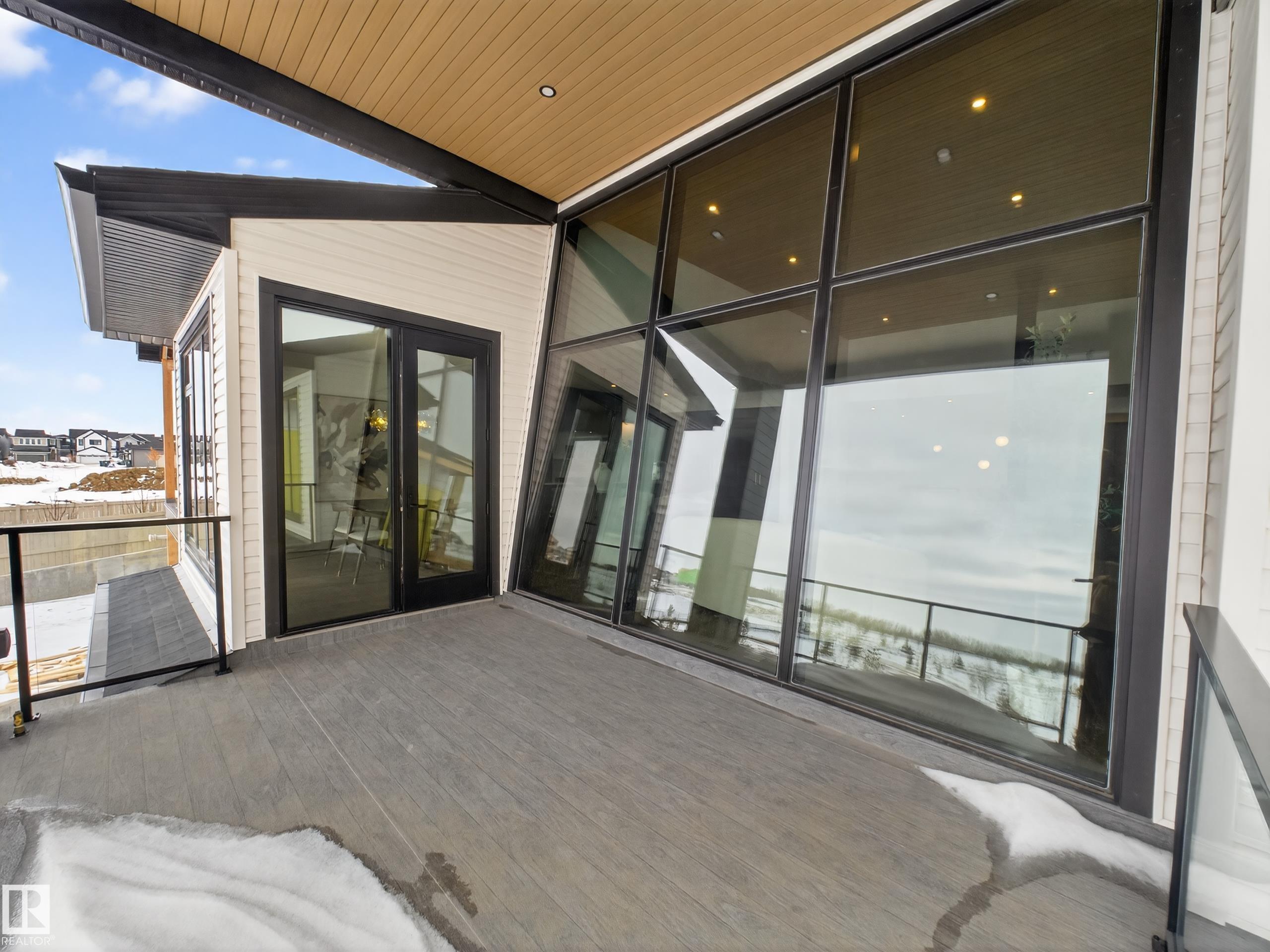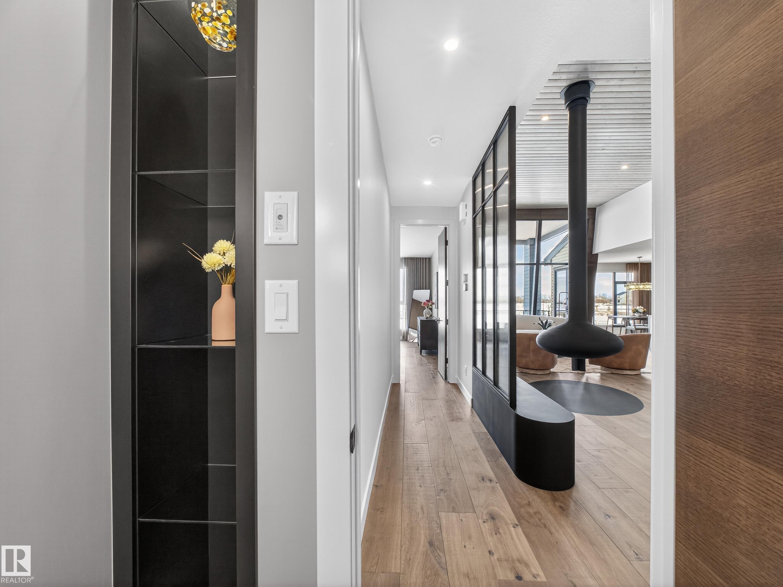 Nestled in a private cul-de-sac in prestigious Élan, this extraordinary 2101 SqFt walkout bungalow backs onto the lake & represents uncompromising craftsmanship by Homes By Sher-Bilt, a boutique luxury builder crafting select custom homes since 1979 with owner Darell Koop personally overseeing every detail. Designed with striking mid-century modern influence, the residence features soaring 13’ ceilings, a dramatic sloped commercial window wall, cedar-clad great room ceiling, and a suspended rotating wood-bu...