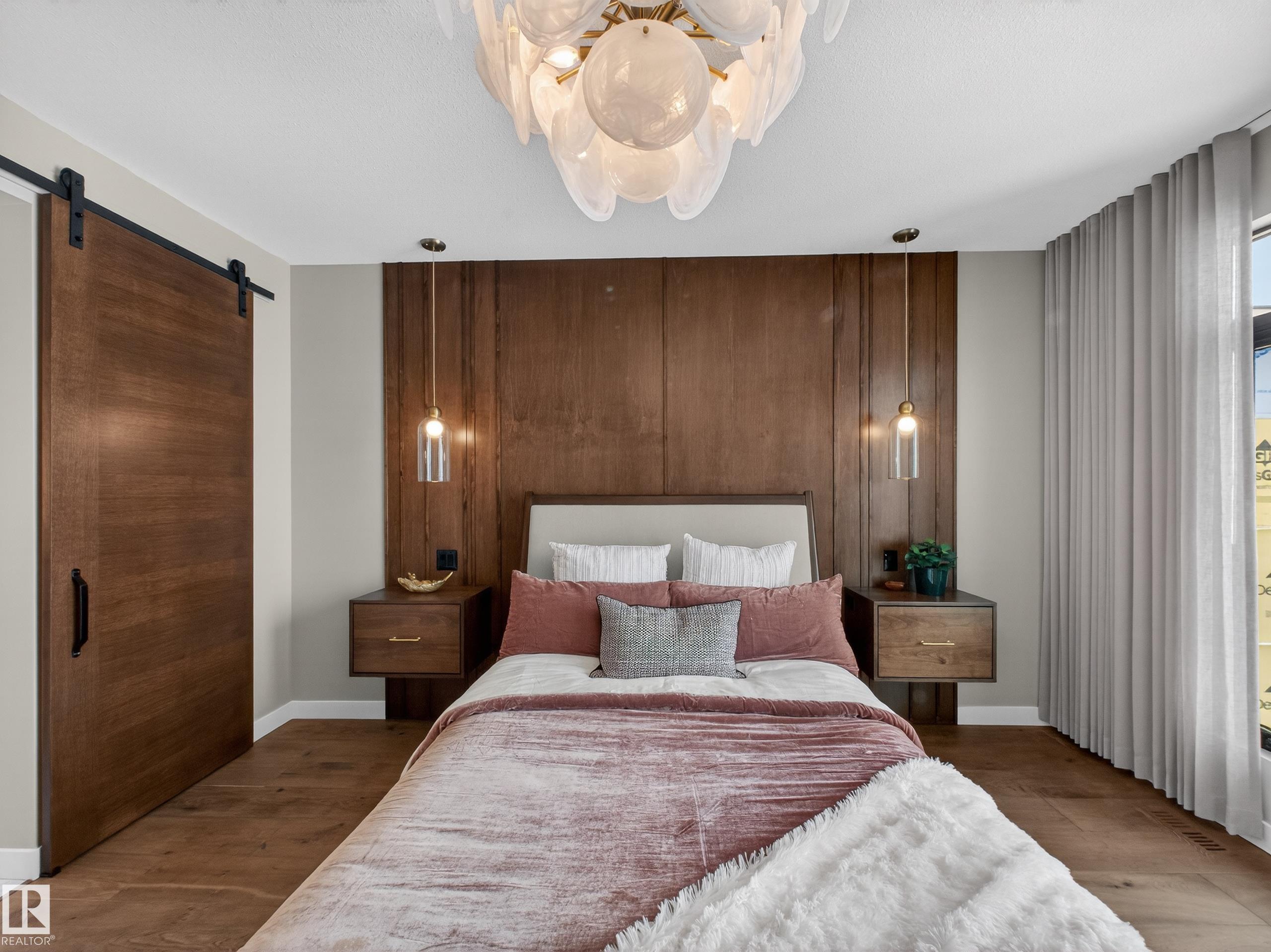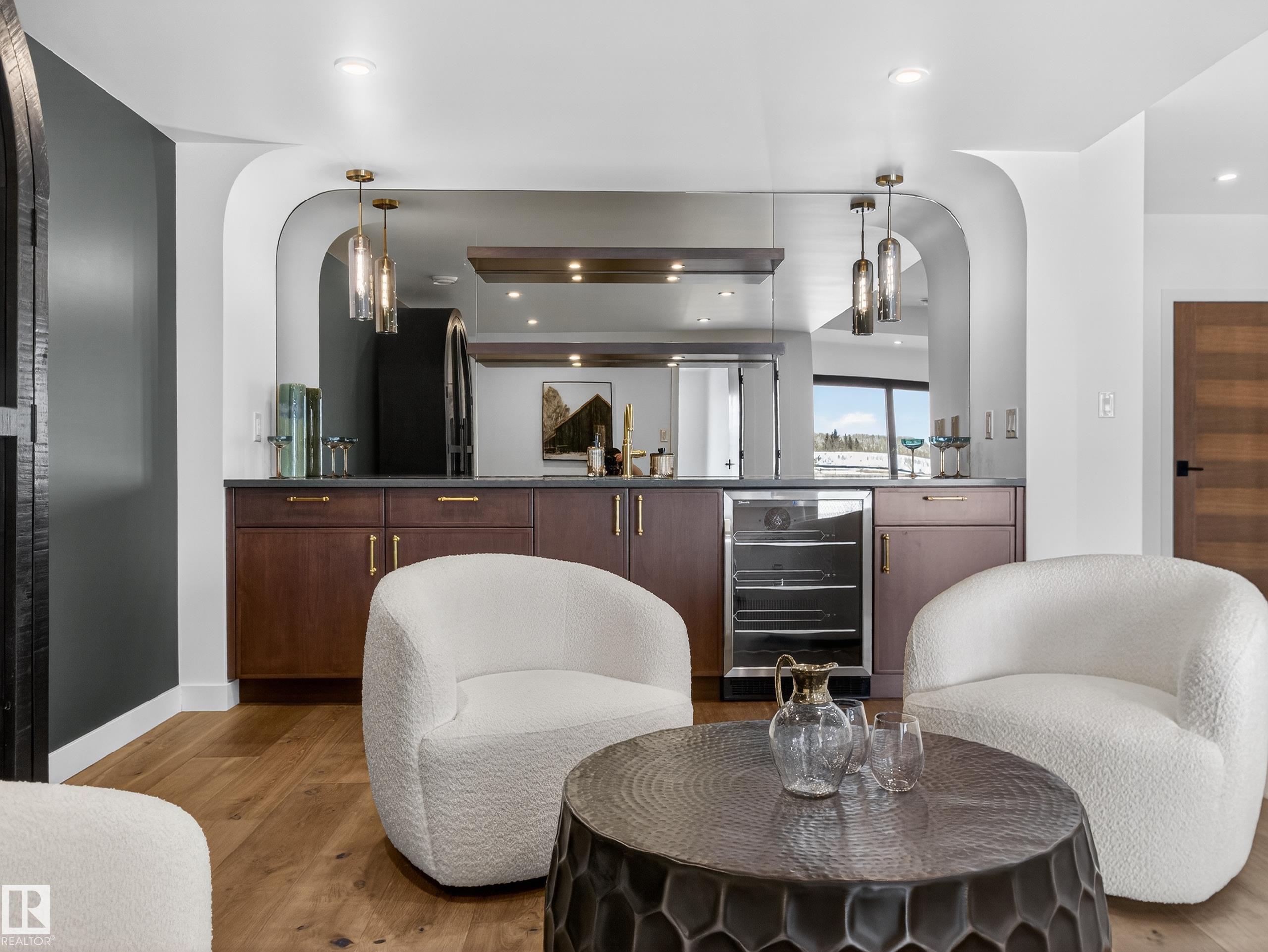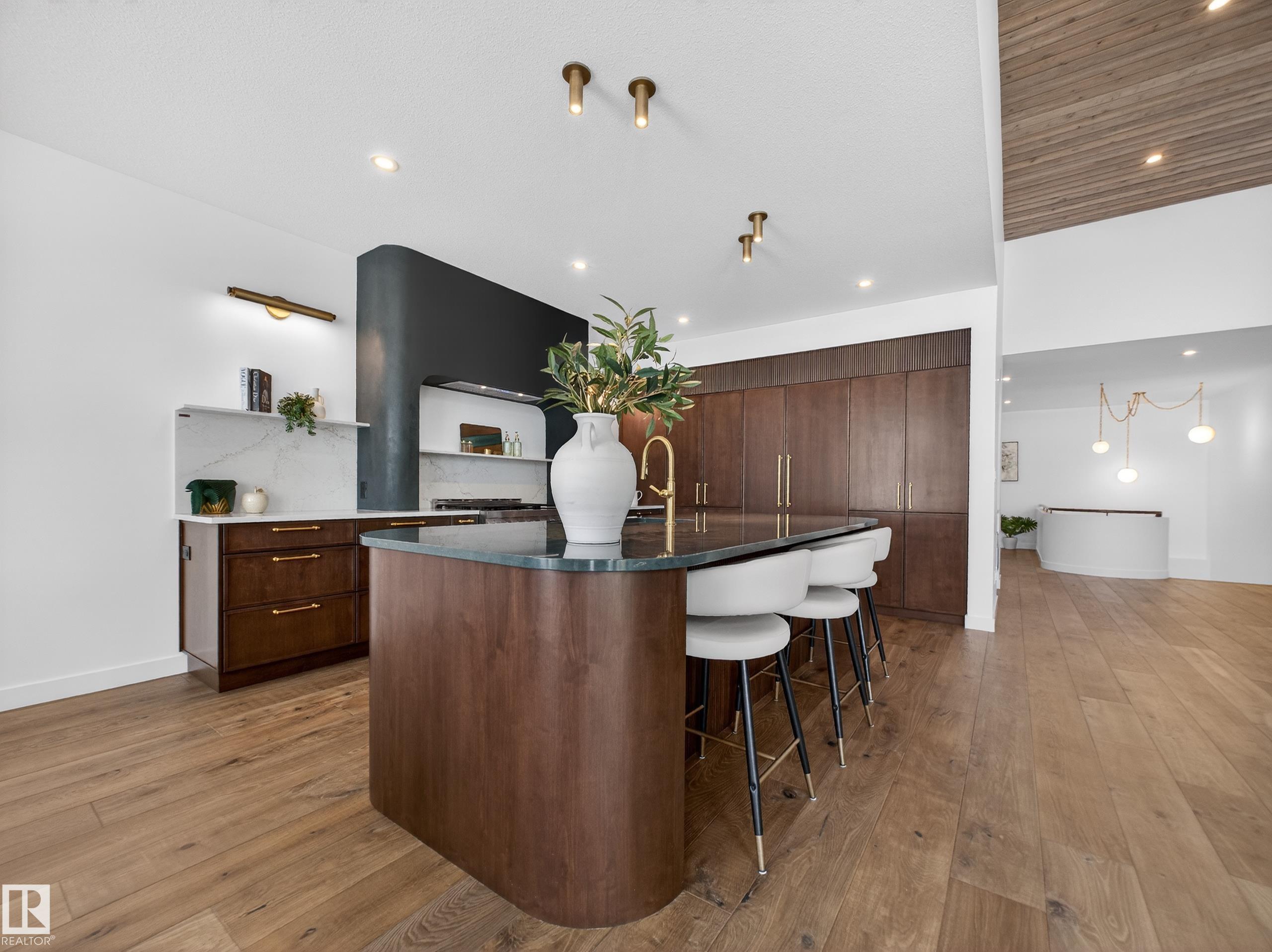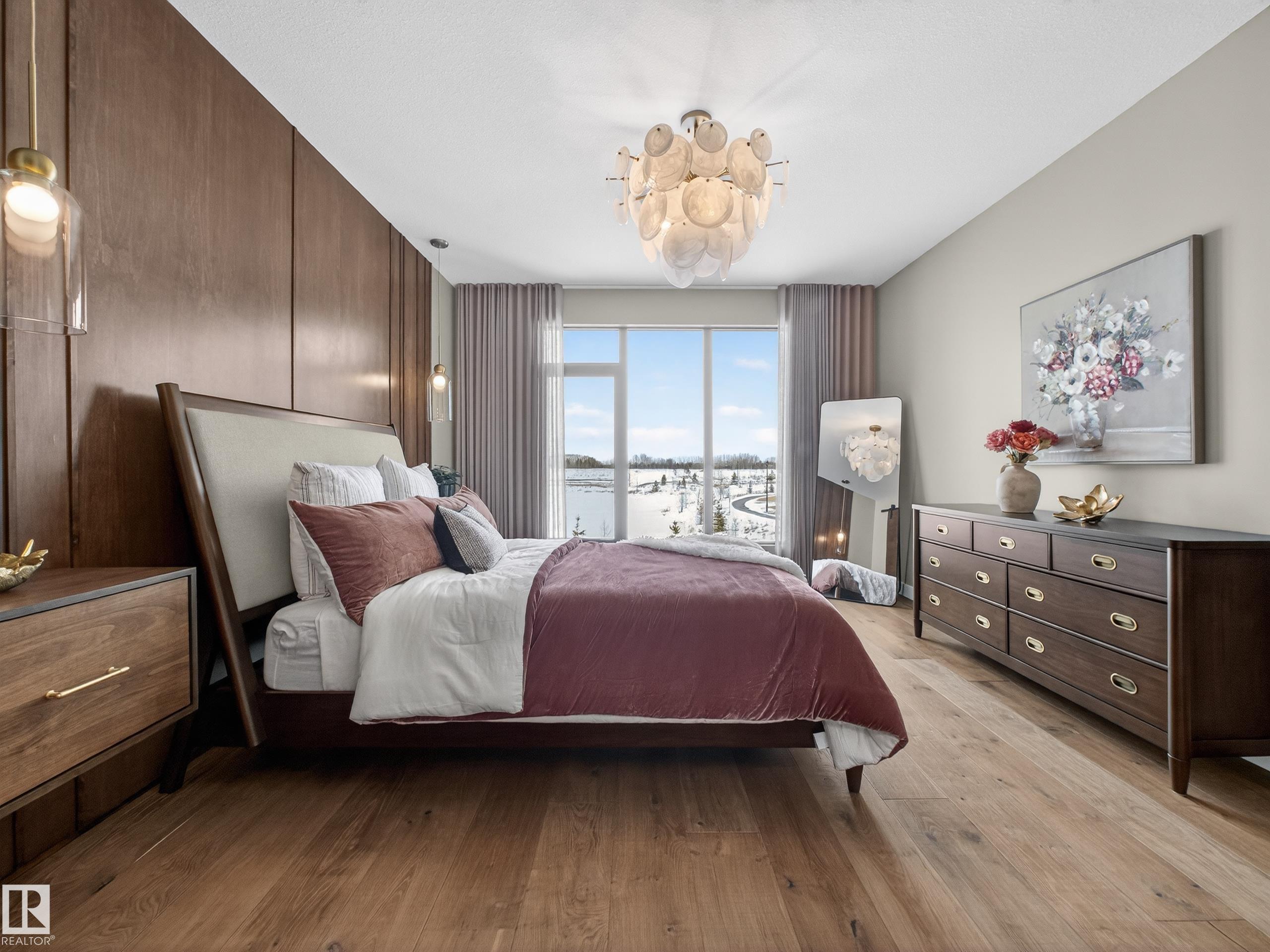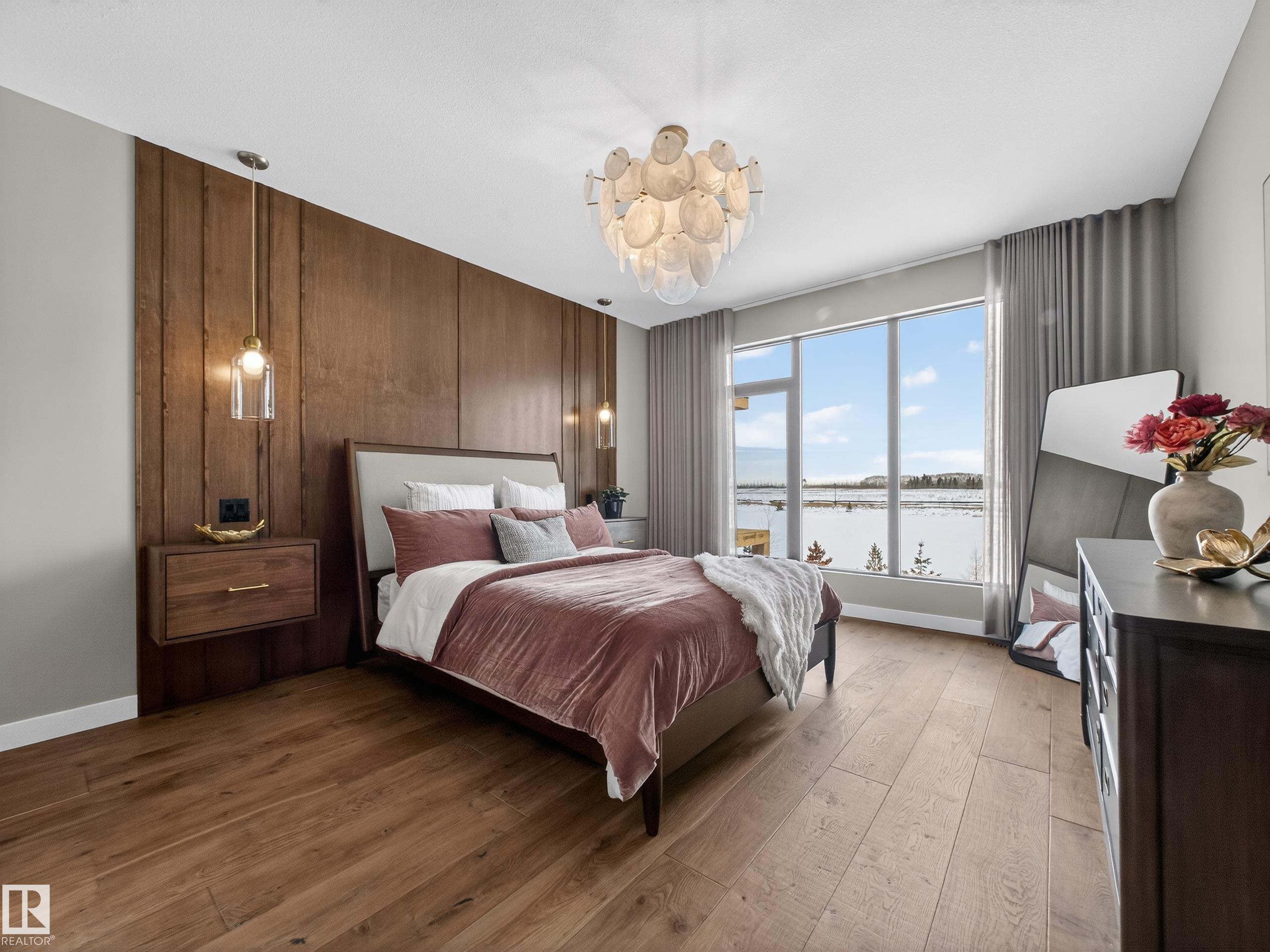 Nestled in a private cul-de-sac in prestigious Élan, this extraordinary 2101 SqFt walkout bungalow backs onto the lake & represents uncompromising craftsmanship by Homes By Sher-Bilt, a boutique luxury builder crafting select custom homes since 1979 with owner Darell Koop personally overseeing every detail. Designed with striking mid-century modern influence, the residence features soaring 13’ ceilings, a dramatic sloped commercial window wall, cedar-clad great room ceiling, and a suspended rotating wood-bu...