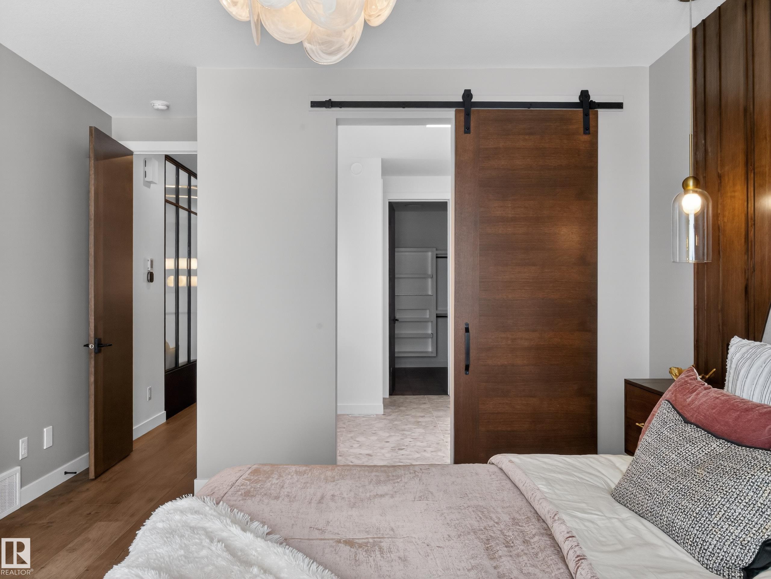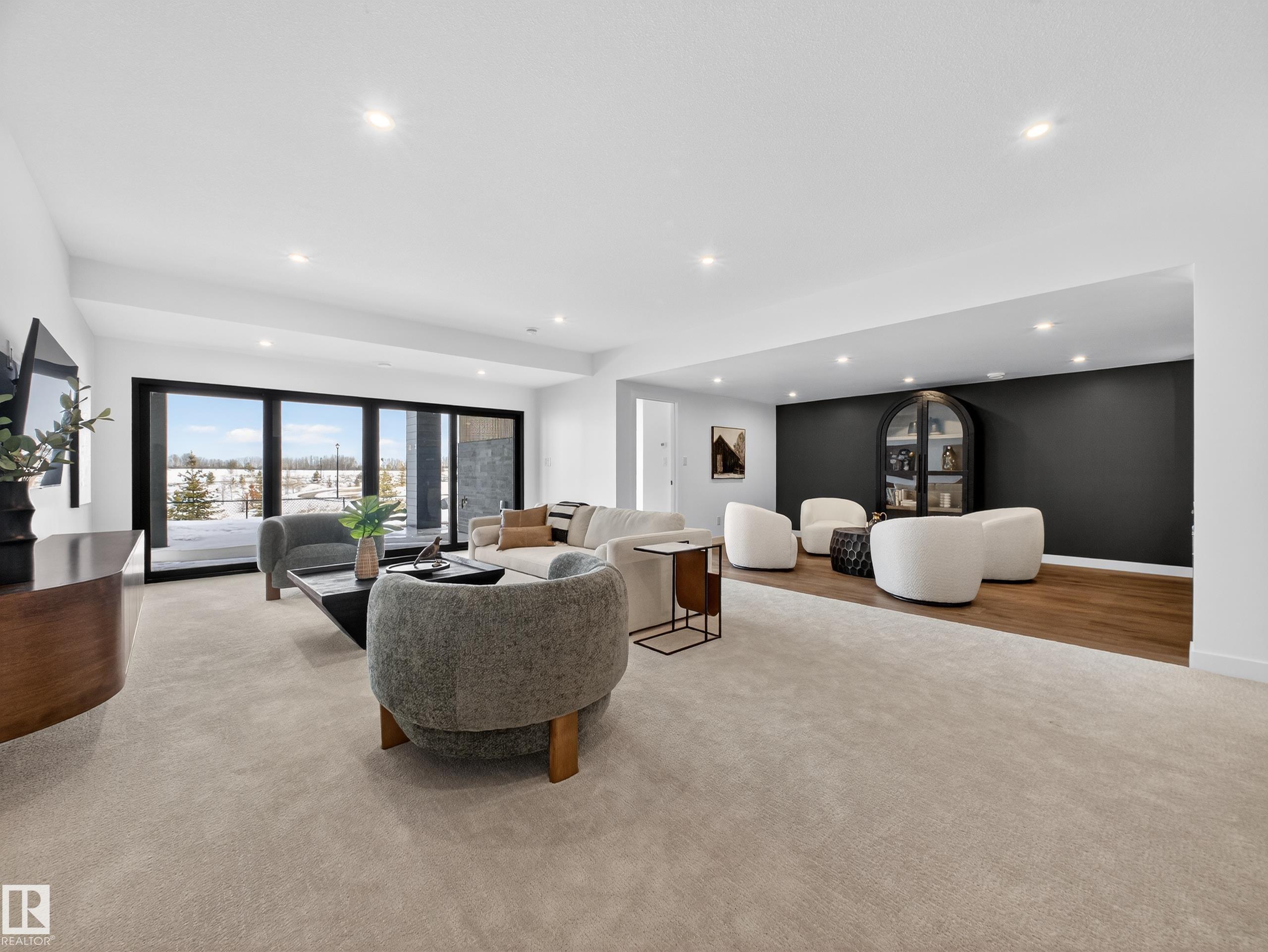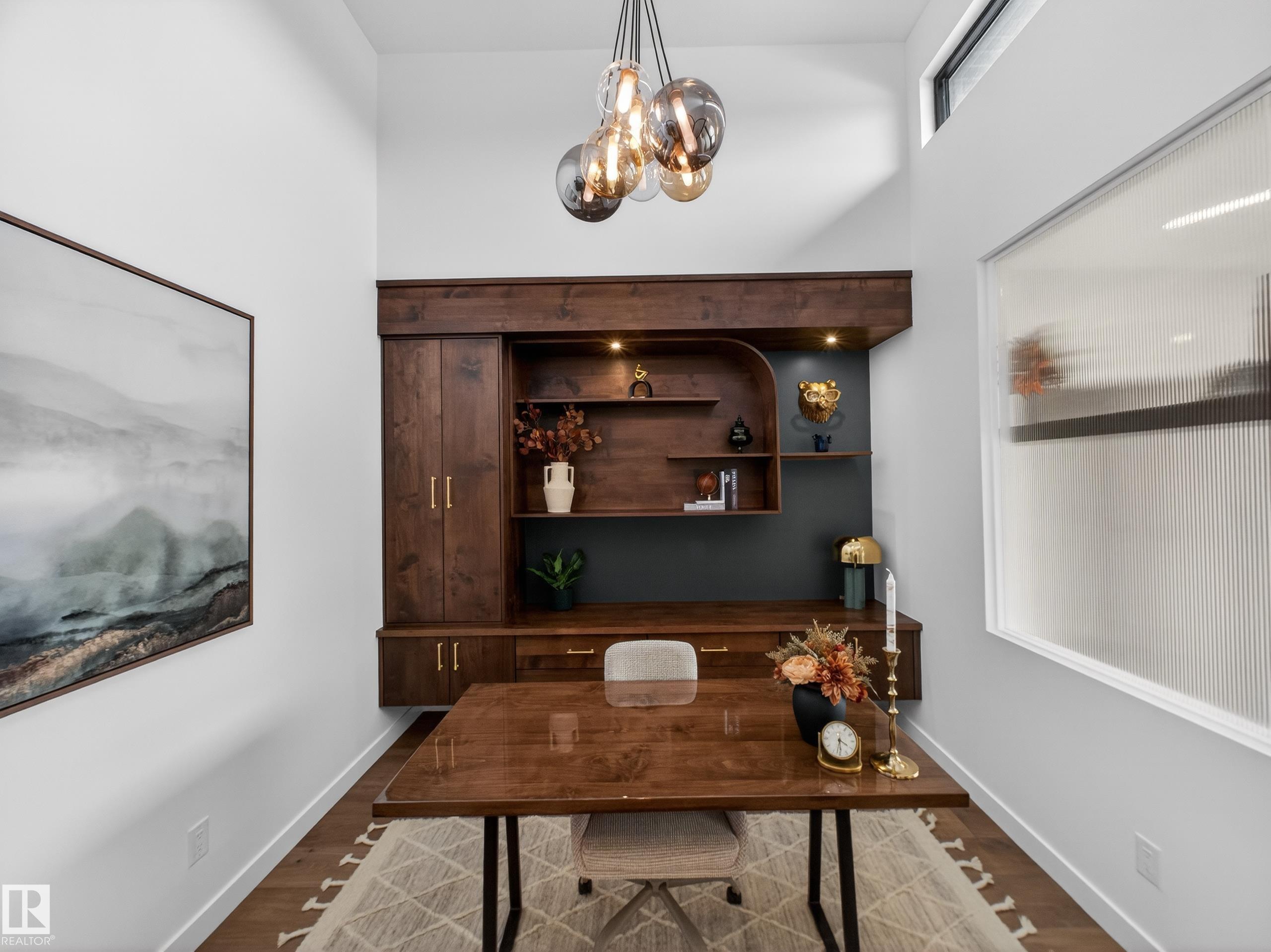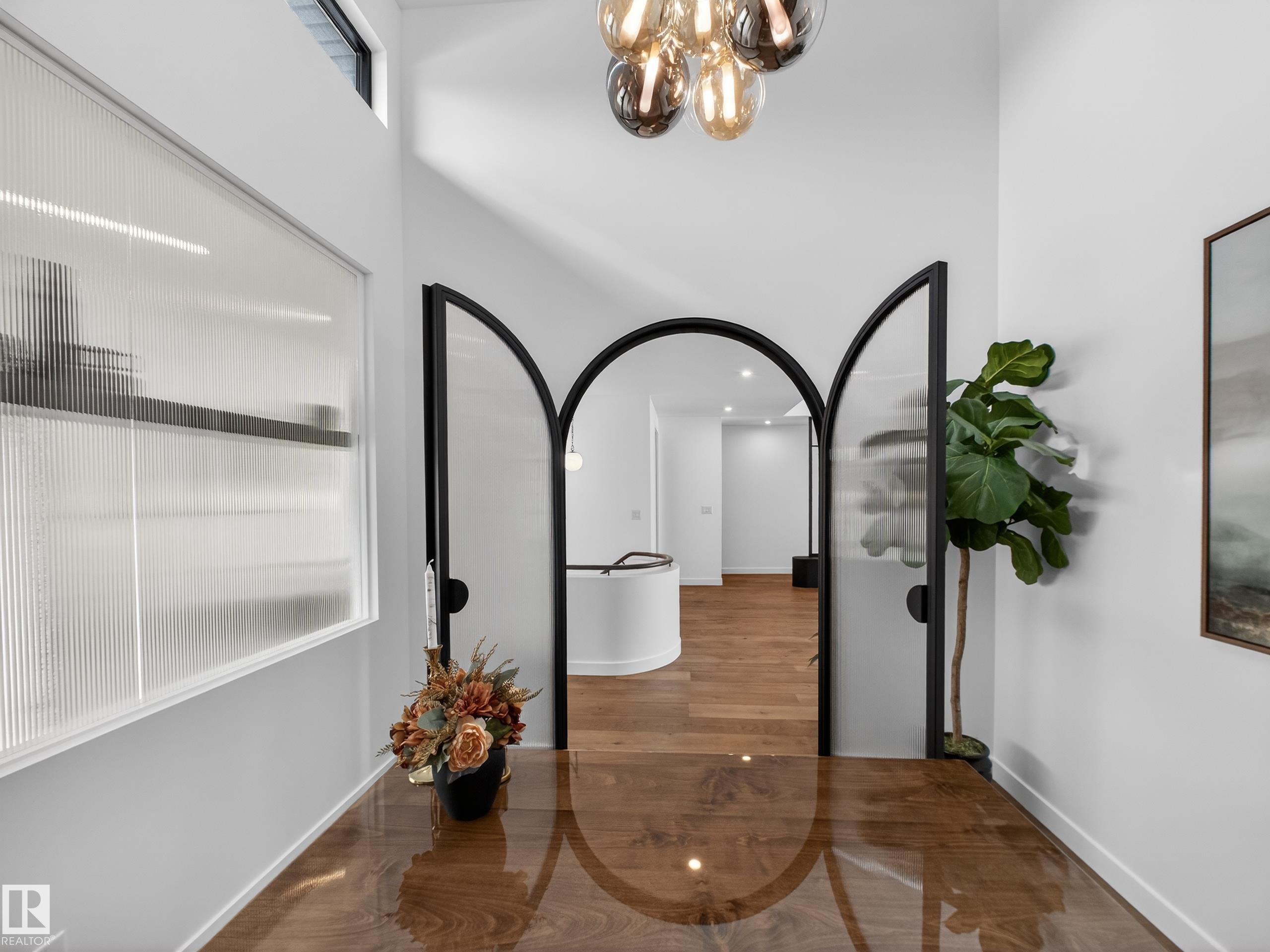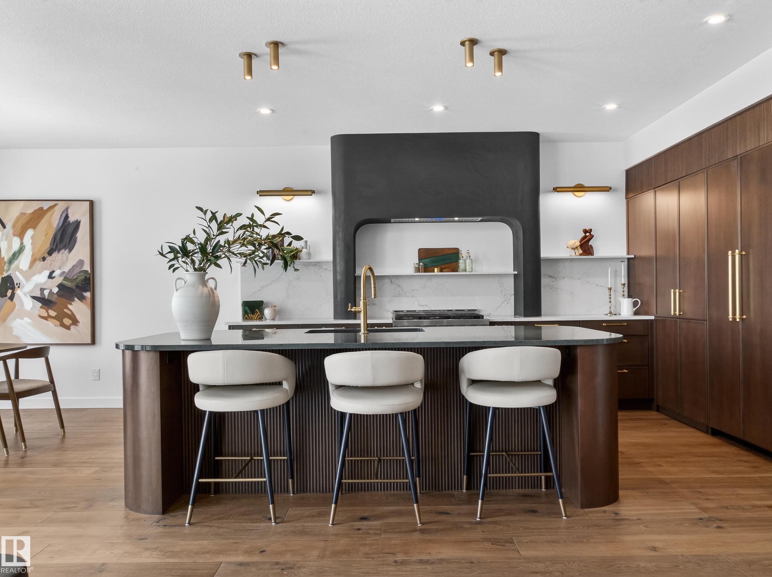 Nestled in a private cul-de-sac in prestigious Élan, this extraordinary 2101 SqFt walkout bungalow backs onto the lake & represents uncompromising craftsmanship by Homes By Sher-Bilt, a boutique luxury builder crafting select custom homes since 1979 with owner Darell Koop personally overseeing every detail. Designed with striking mid-century modern influence, the residence features soaring 13’ ceilings, a dramatic sloped commercial window wall, cedar-clad great room ceiling, and a suspended rotating wood-bu...