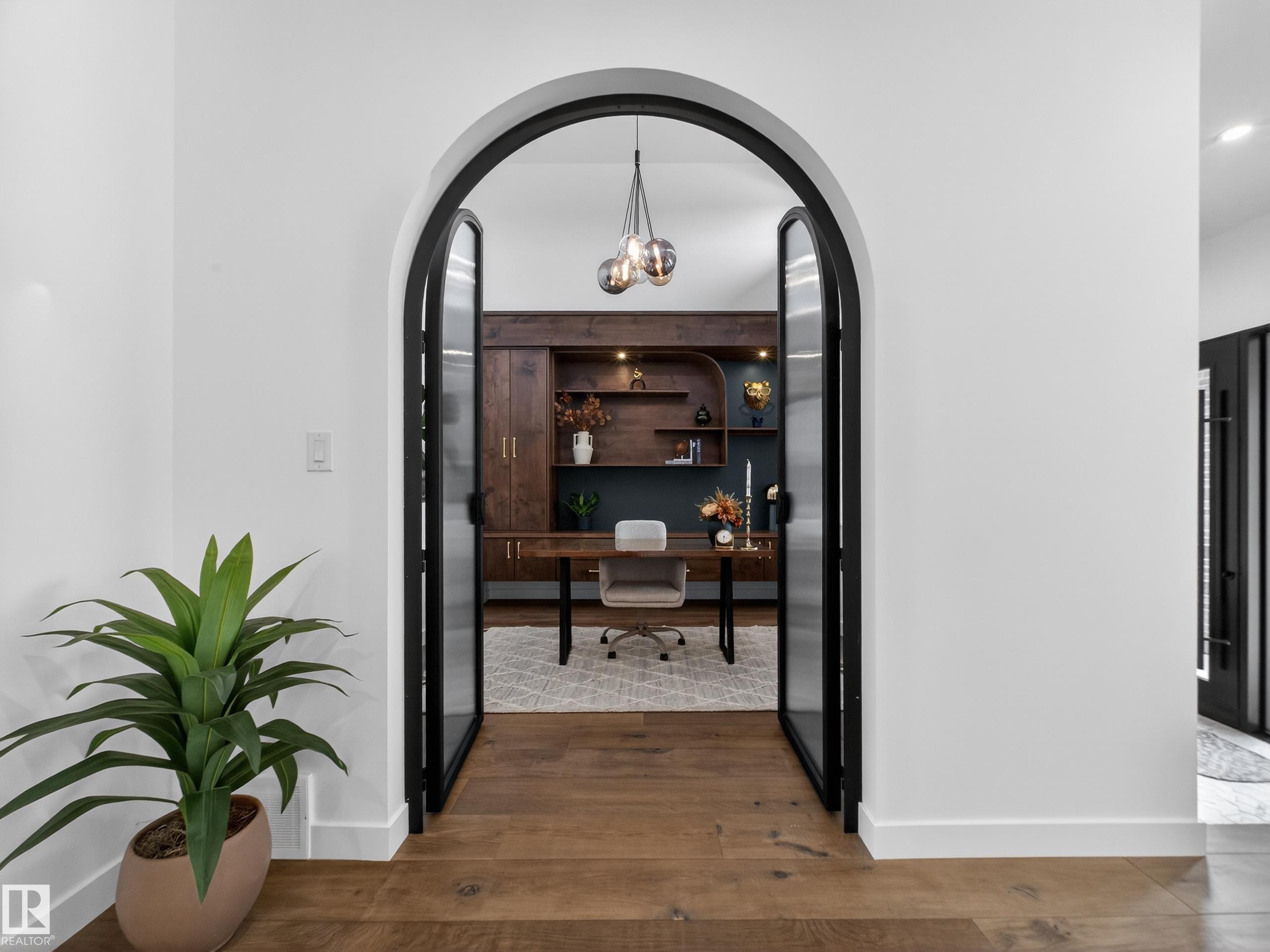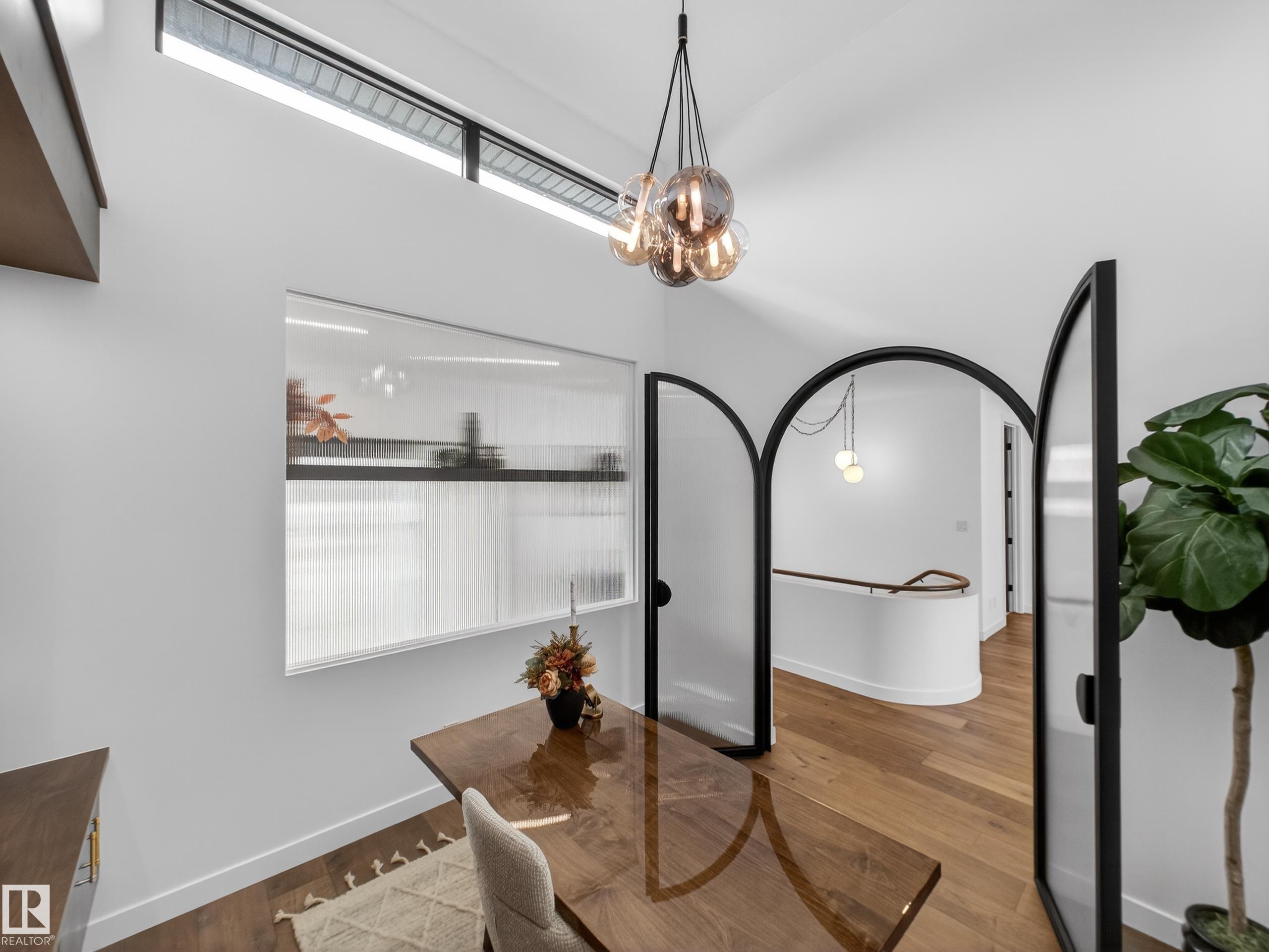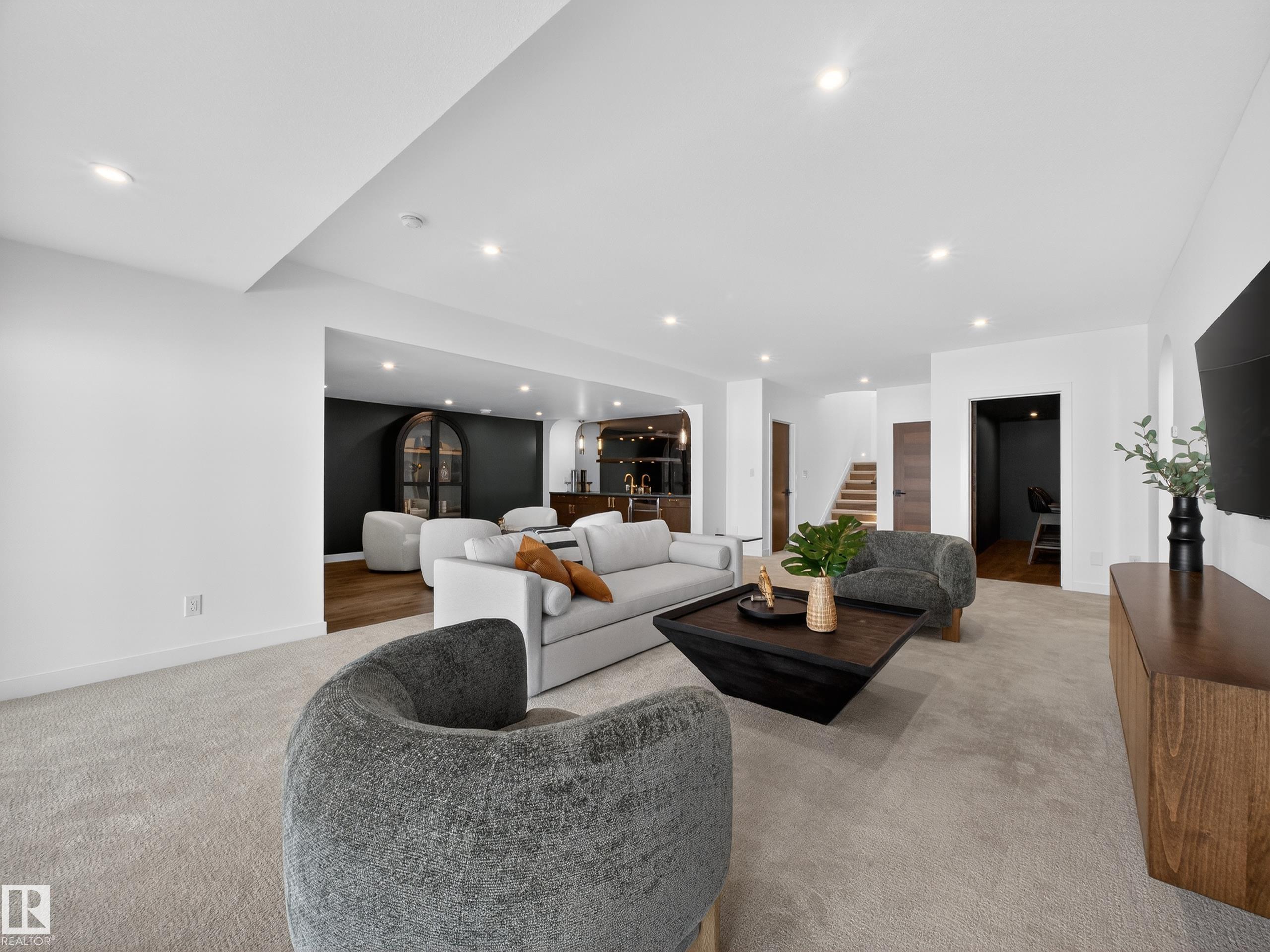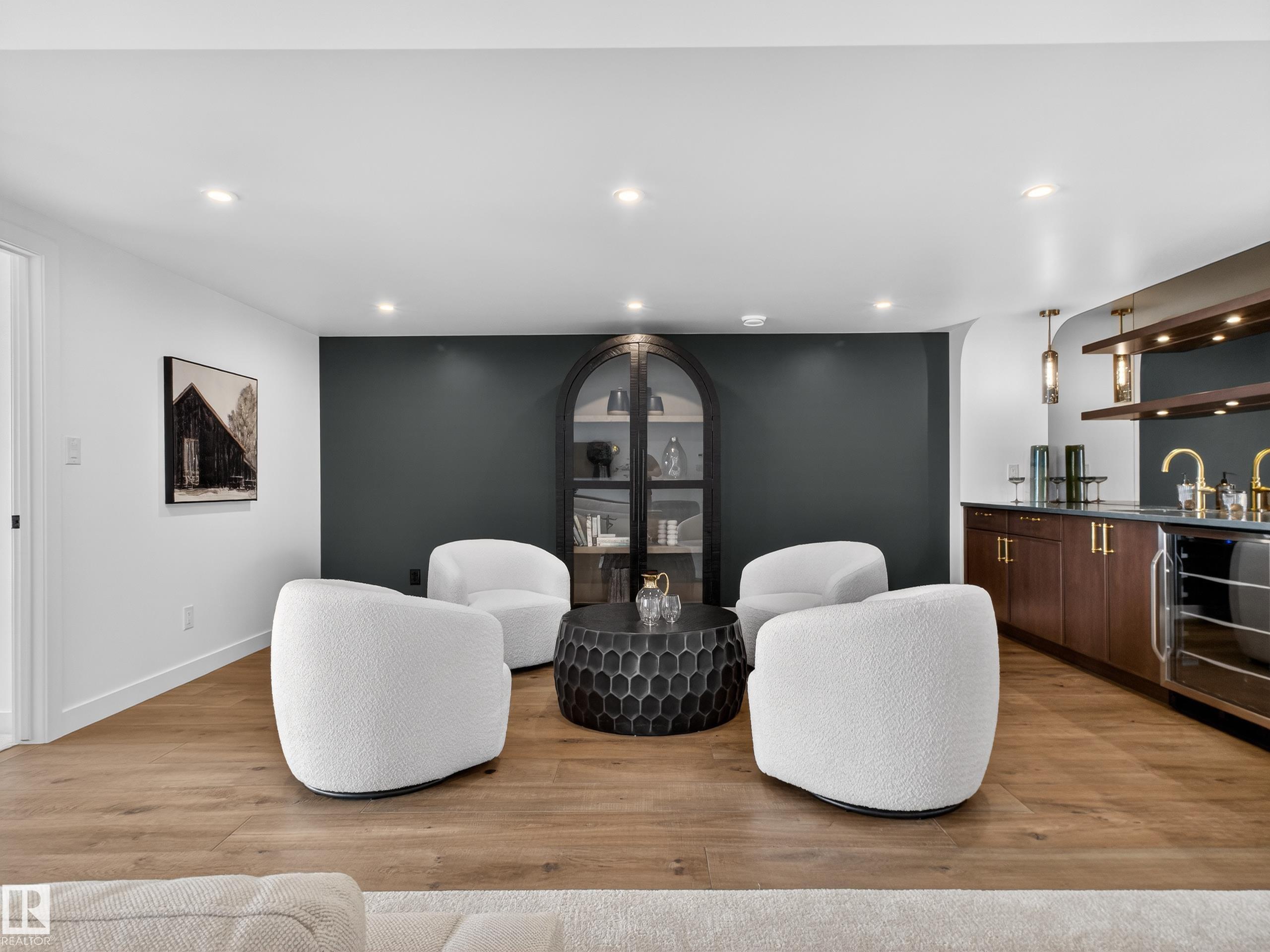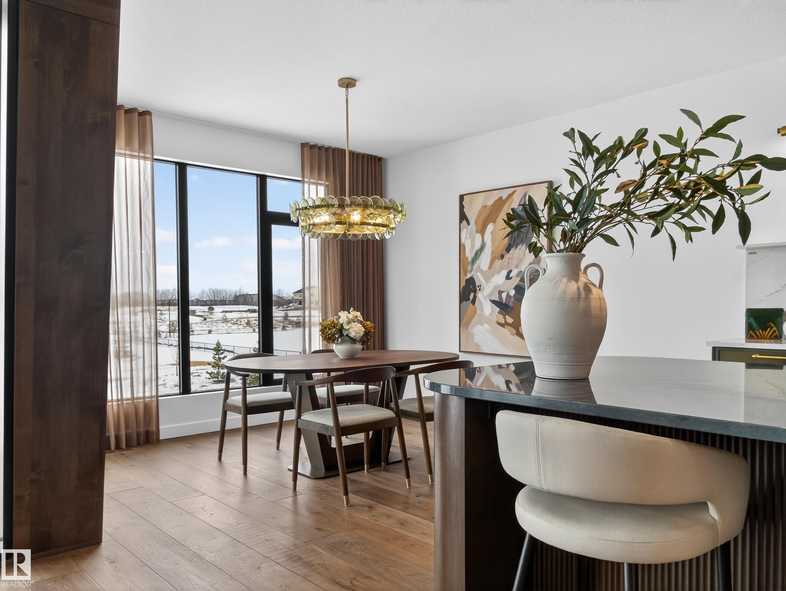 Nestled in a private cul-de-sac in prestigious Élan, this extraordinary 2101 SqFt walkout bungalow backs onto the lake & represents uncompromising craftsmanship by Homes By Sher-Bilt, a boutique luxury builder crafting select custom homes since 1979 with owner Darell Koop personally overseeing every detail. Designed with striking mid-century modern influence, the residence features soaring 13’ ceilings, a dramatic sloped commercial window wall, cedar-clad great room ceiling, and a suspended rotating wood-bu...