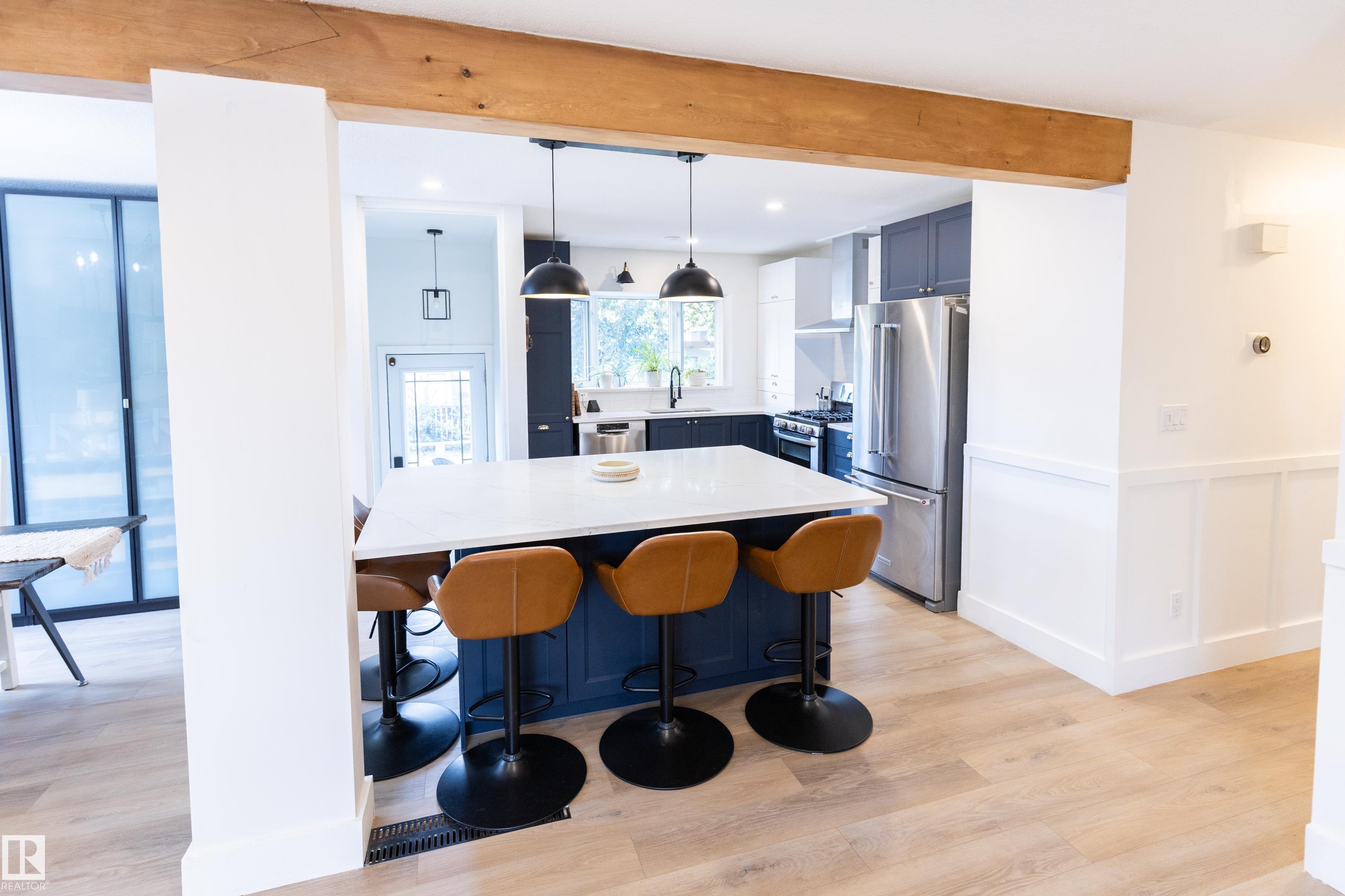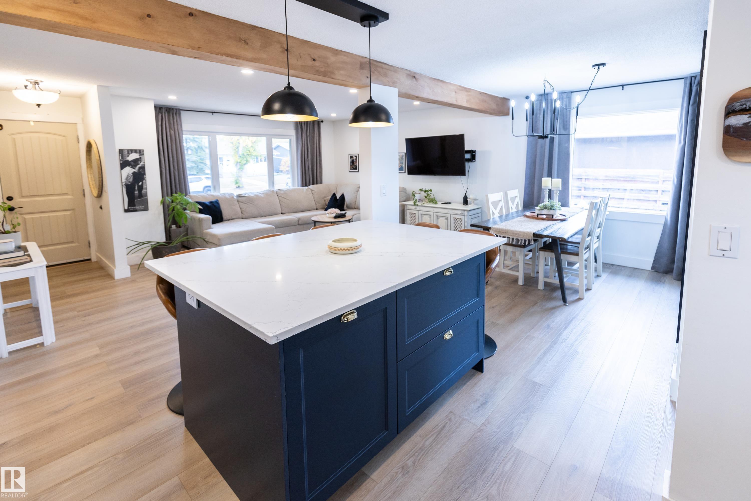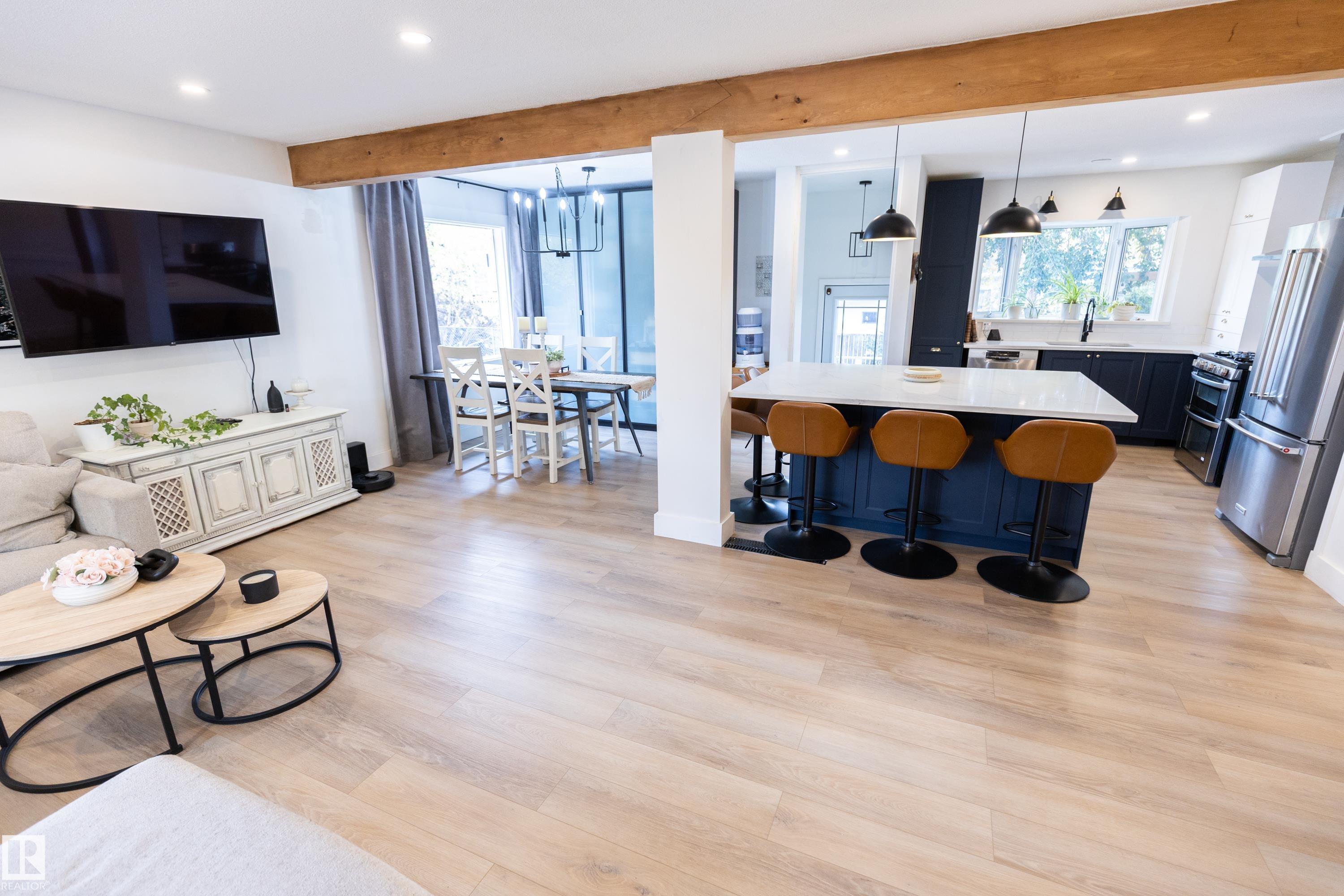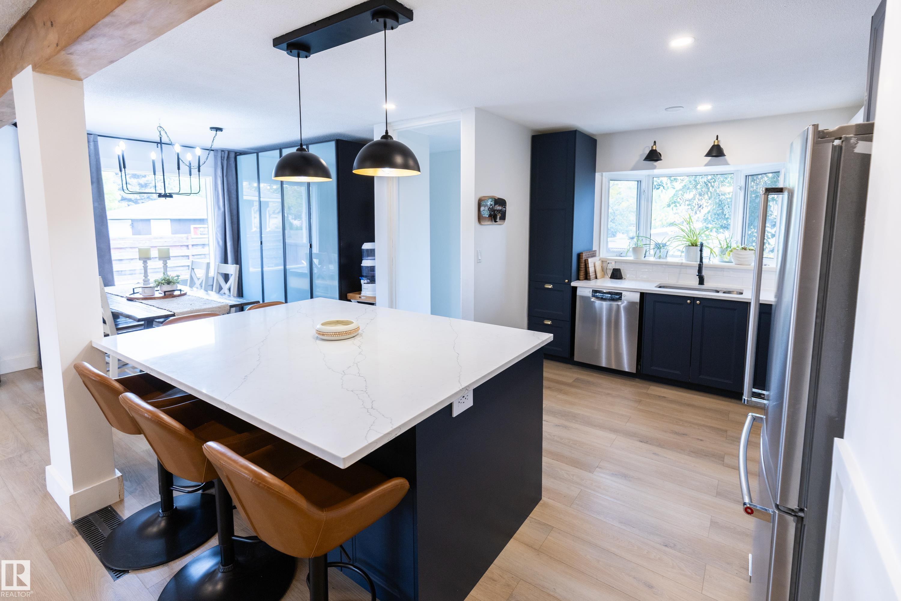 Welcome to this beautifully updated bungalow. The low-maintenance front yard is designed with rock flower beds and walkways that lead to a spacious front entry featuring a built-in seat & feature wood wall. Inside, the bright & open living room offers a large window that floods the space with natural light & showcases new vinyl plank flooring. The stunning, fully renovated kitchen boasts a tile backsplash, quartz counters, stainless steel appliances with gas stove & a huge island seating five that opens to...